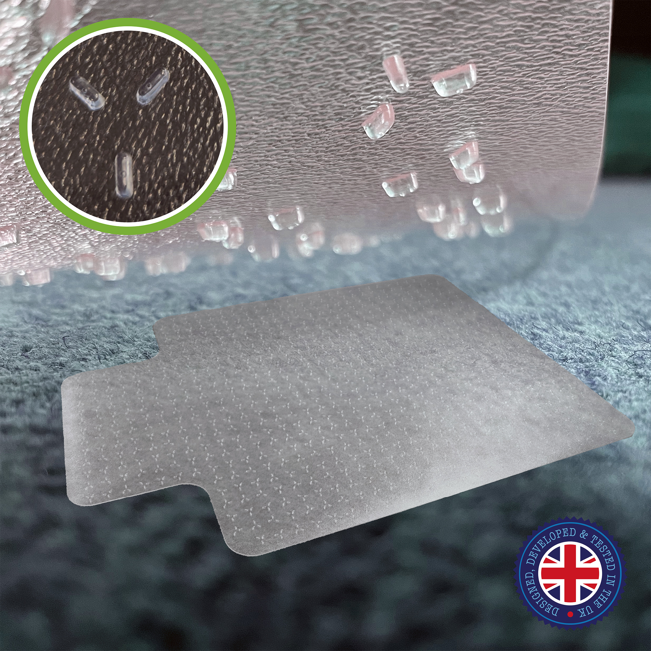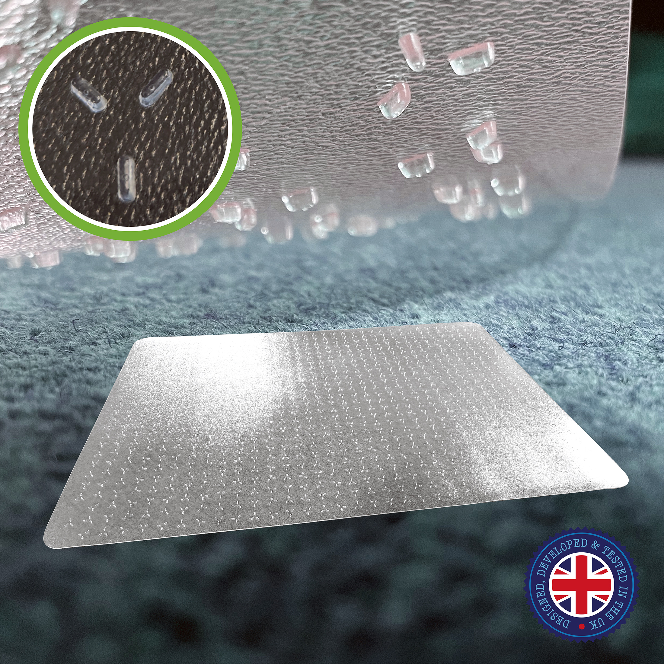 Clear floor protection mats made from our unique PVC formulation to provide optimum performance and durability. Guaranteed not to crack, chip, break or shatter under normal use and correct application. Prevents damage and wear to carpeted floors, up to 6mm deep, often caused by chair casters and foot wear. Ideal for use with a computer desk or workstation in the home or office.
