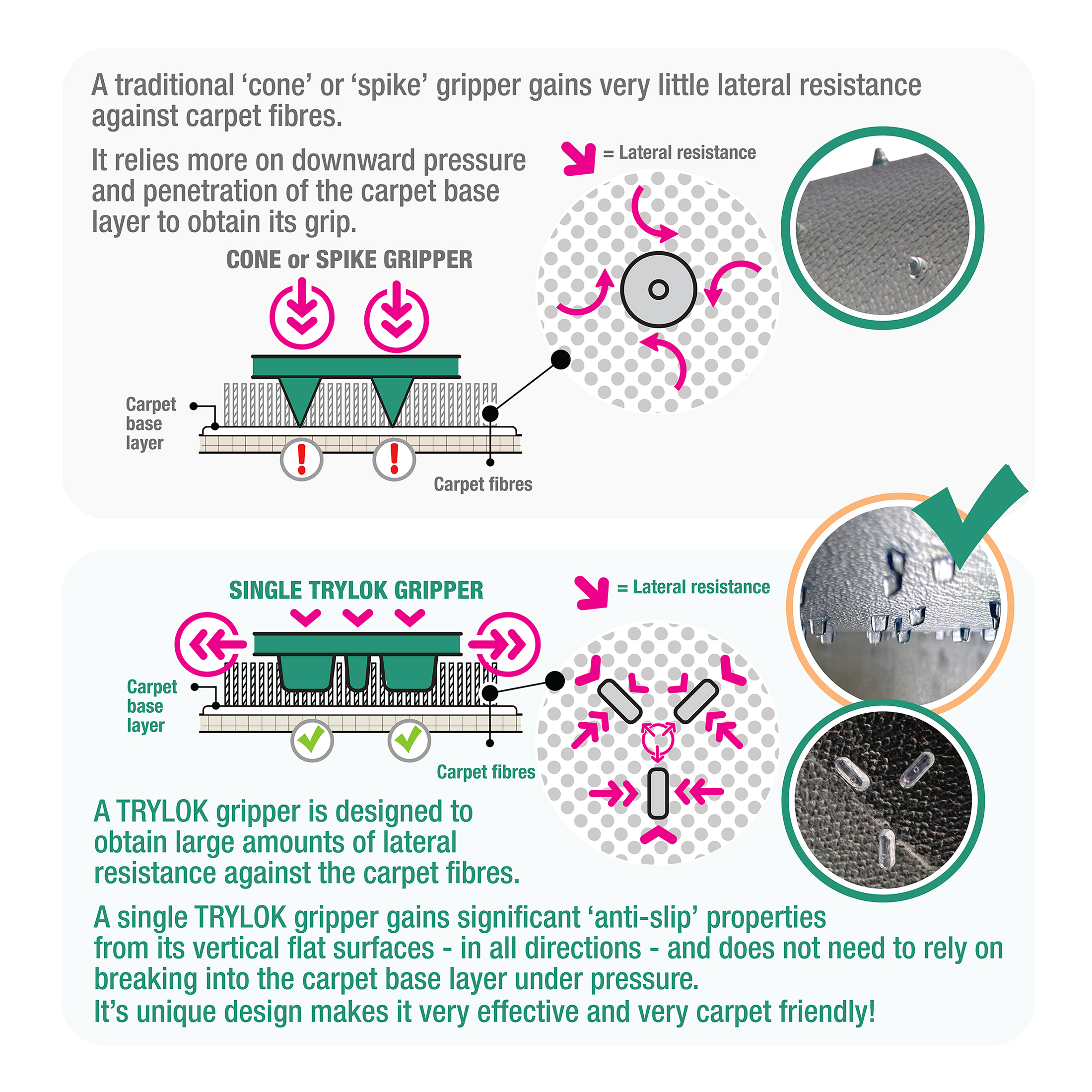 Our new and totally unique TrYlok stability system provides multi-directional cleats that is tried and tested to provide maximum resistance to movement in any direction, for ultimate stability. Provides up to 20% improved slide resistance compared to traditional spiked grippers.