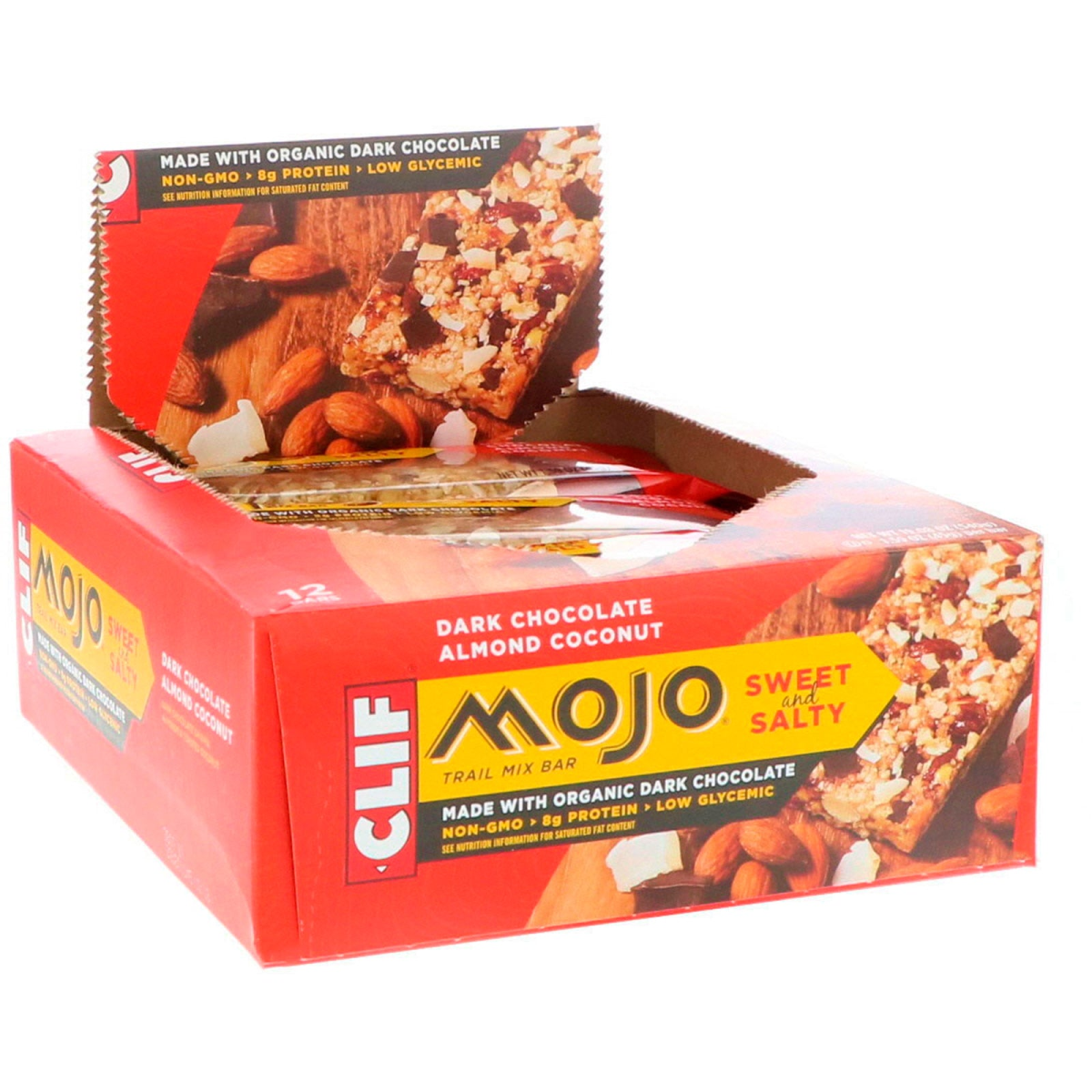 Dark Chocolate Chunks, Almonds & Toasted Coconut Made with Organic Dark Chocolate Non-GMO 8 g Protein Low Glycemic Kosher Certified Organic by QAI Clif Bar Family Foundation Not Your Ordinary Snack Clif Mojo Sweet and Salty Trail Mix Bar is made for mixing it up and discovering all the good stuff the day has to offer. Ready to go whenever and wherever you are, Clif Mojo combines simple and organic ingredients that are both nutritious and good for the planet. Clif Mojo is a delicious way to energize your day. Grab a Mojo and go!
