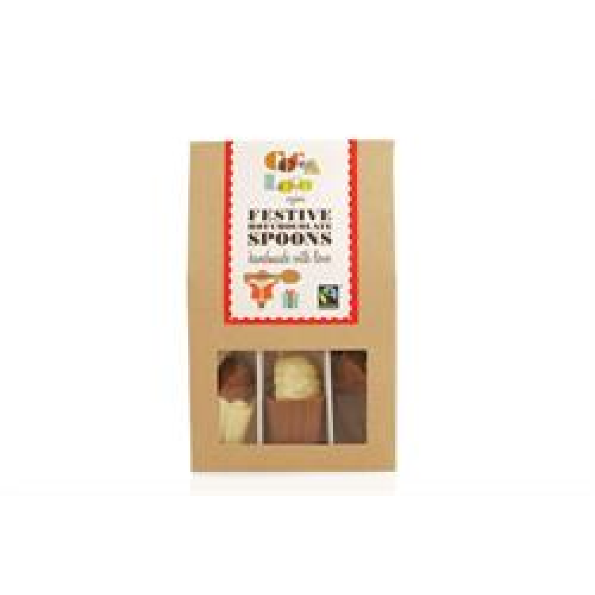 Get festive with our hot chocolate spoon set contains three hot chocolate spoons made from our smooth 56% dark chocolate, our creamy 37% milk chocolate and our wonderful white chocolate, perfect for any taste buds. Each spoon is topped with a festive treat of either a little chocolate Santa or chocolate present.