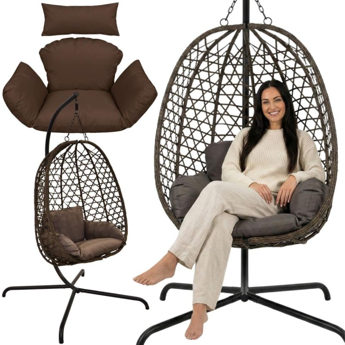 The COCOON HANGING CHAIR WITH A 195CM FRAME, DARK BROWN, 120KG, combines functionality with a stylish design. Thanks to its own, stable base (100x100x196 cm), it requires no ceiling or beam mounting. It's perfect for the garden, terrace, balcony, or even the living room, creating a comfortable place to read, relax, or unwind.