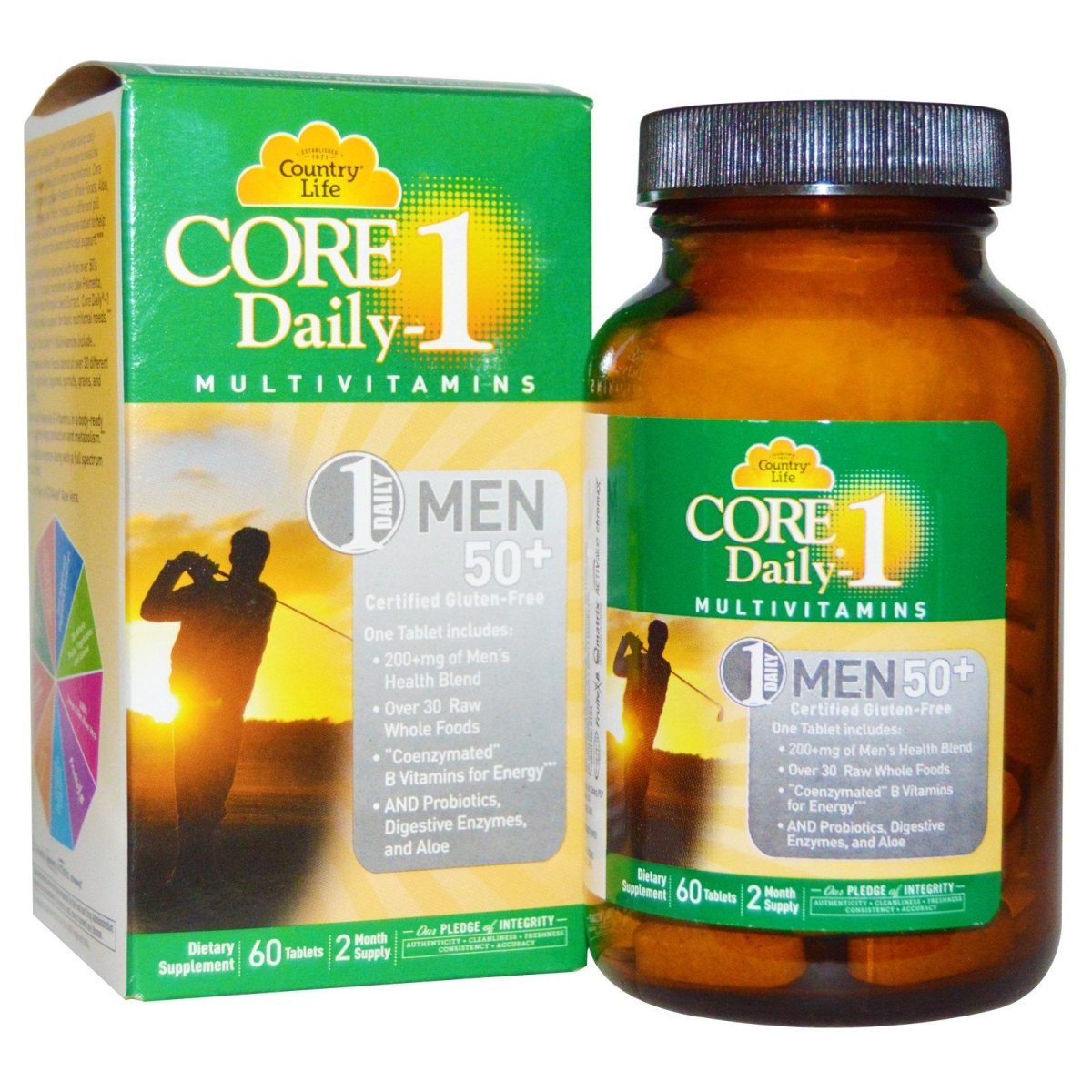 1 Daily Certified Gluten-Free Dietary Supplement 2 Month Supply Sharp PS gold FruiteX B Chromax Activealoe This Product has been manufactured at a GMP Registered Facility Matrix Proprietary Processing One Tablet Includes: 200+ mg of Men's Health Blend Over 30 Raw Whole Foods "Coenzymated" B Vitamins for Energy And Probiotics, Digestive Enzymes, and Aloe -Our Pledge Of Integrity- Authencity Cleanliness Freshness Consistency Accuracy Country Life's Core Daily - 1 line makes taking daily supplements even easier. With just one easy to swallow tablet, you get more than just a simple multi-vitamin. Core Daily - 1 Multivitamins contain Probiotics, Whole Foods, Aloe, B Vitamins, enzymes and more. Instead of 6 different pill bottles, it's just one comprehensive tablet to help you with versatile, across the board nutritional support. This Formula is specially designed with Men over 50's health in mind. It includes ingredients like saw palmetto, pygeum, lycopene and Pumpkin Seed Extract. Core Daily - 1 Men's 50+ provides daily support for basic nutritional needs. All Country Life Core Daily - 1 Multivitamins include A comprehensive Whole Foods blend of over 30 different raw fruits, vegetables, legumes, sprouts, grains, and superfoods. "Coenzymated" essential B-Vitamins in a body-ready state to support energy enzymes along with a full spectrum probiotic blend. 100% inner fillet of Activaloe Full Spectrum Digestive Enzymes 28 Whole Fruits, Vegetables and Grains 100% Inner Fillet Aloe Vera Includes Whole Food Vitamin C Includes Vitamin K2 Full Spectrum Probiotic Blend Coenzyme B-Vitamins Saw Palmetto Pygeum & Pumpkin Seed Extracts