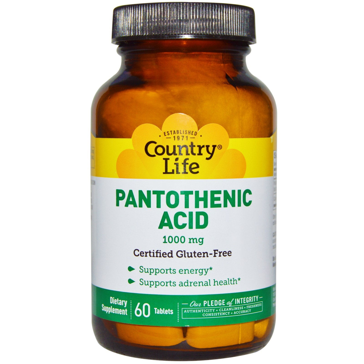 Established 1971 Certified Gluten-Free Supports Energy Supports Adrenal Health Dietary Supplement Kosher Parve Our Pledge of Integrity Authenticity Cleanliness Freshness Consistency Accuracy Pantothenic acid supports the production of energy, the synthesis of adrenal hormones and carbohydrate/protein metabolism. Yes Certified Gluten-Free by GFCO Yes Certified Vegan by the AVA Yes Recyclable Packaging Yes Manufacturing Supports Wind Power Yes Kosher Parve No Yeast, Wheat or Corn No Soy or Milk No Sugar or Salt No Preservatives No Artificial Color This product has been manufactured at a GMP Registered facility.