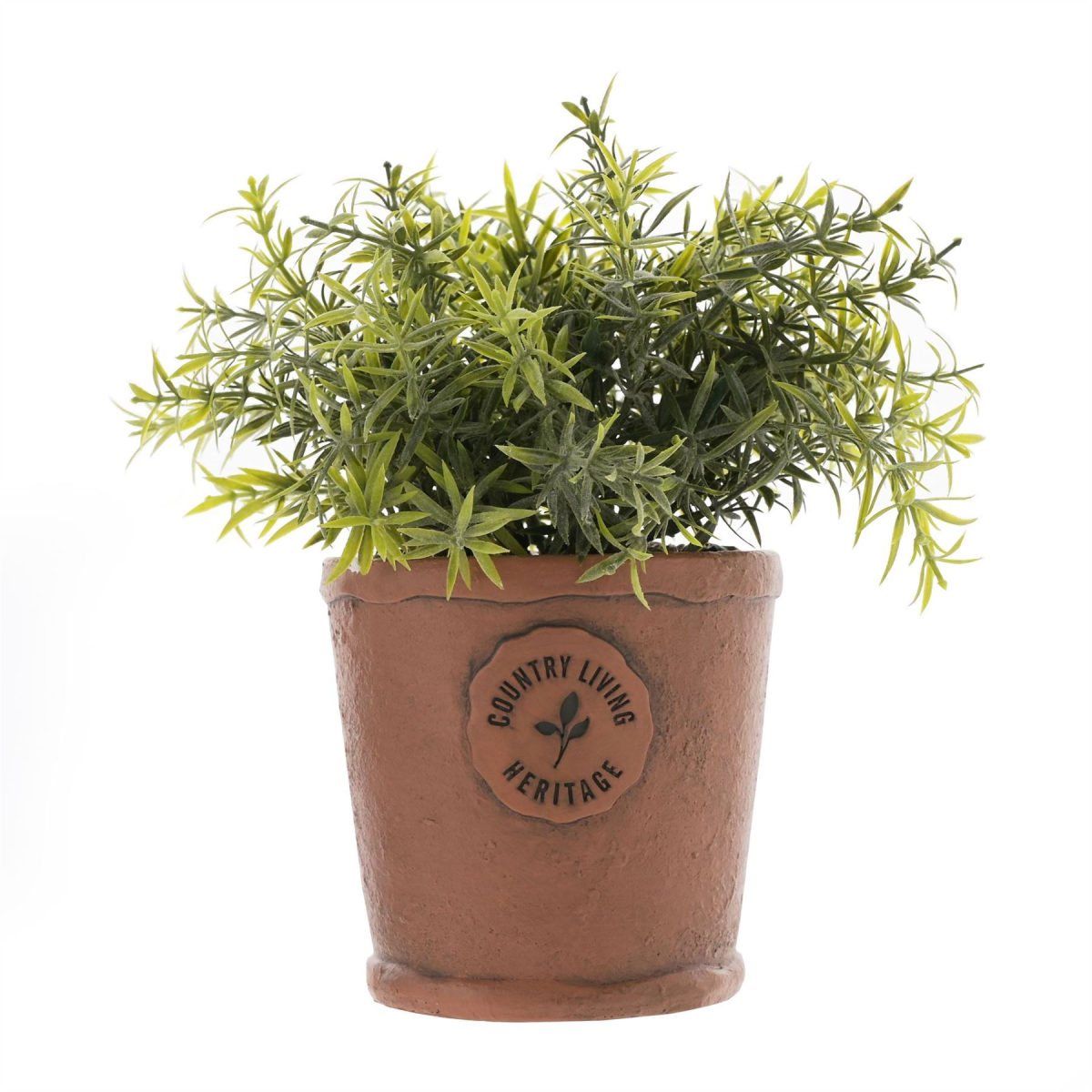 The polyresin pot features an aged appearance and �Country Living Heritage� emblem on the front. Inside the pot sits a faux herb planter and pebbles which would complement any living space, conservatory or garden.