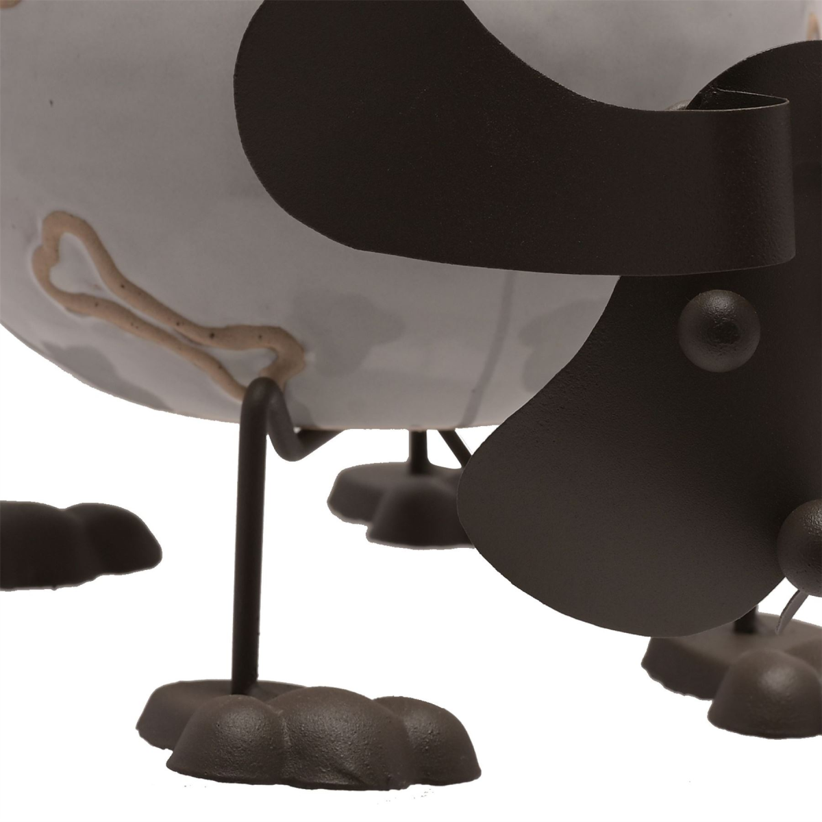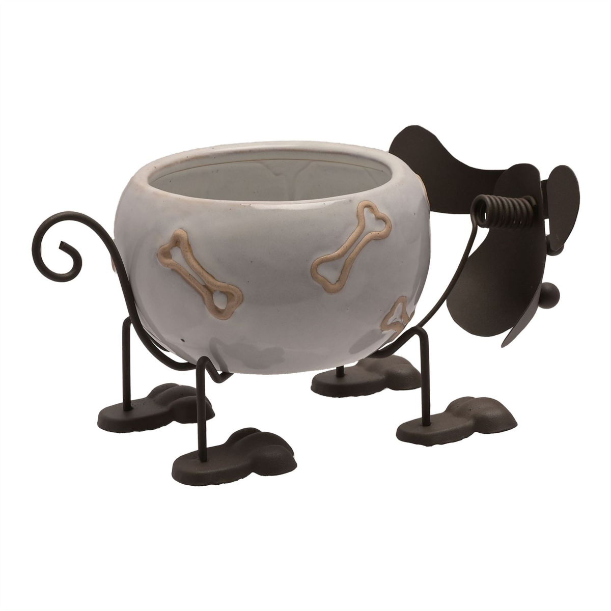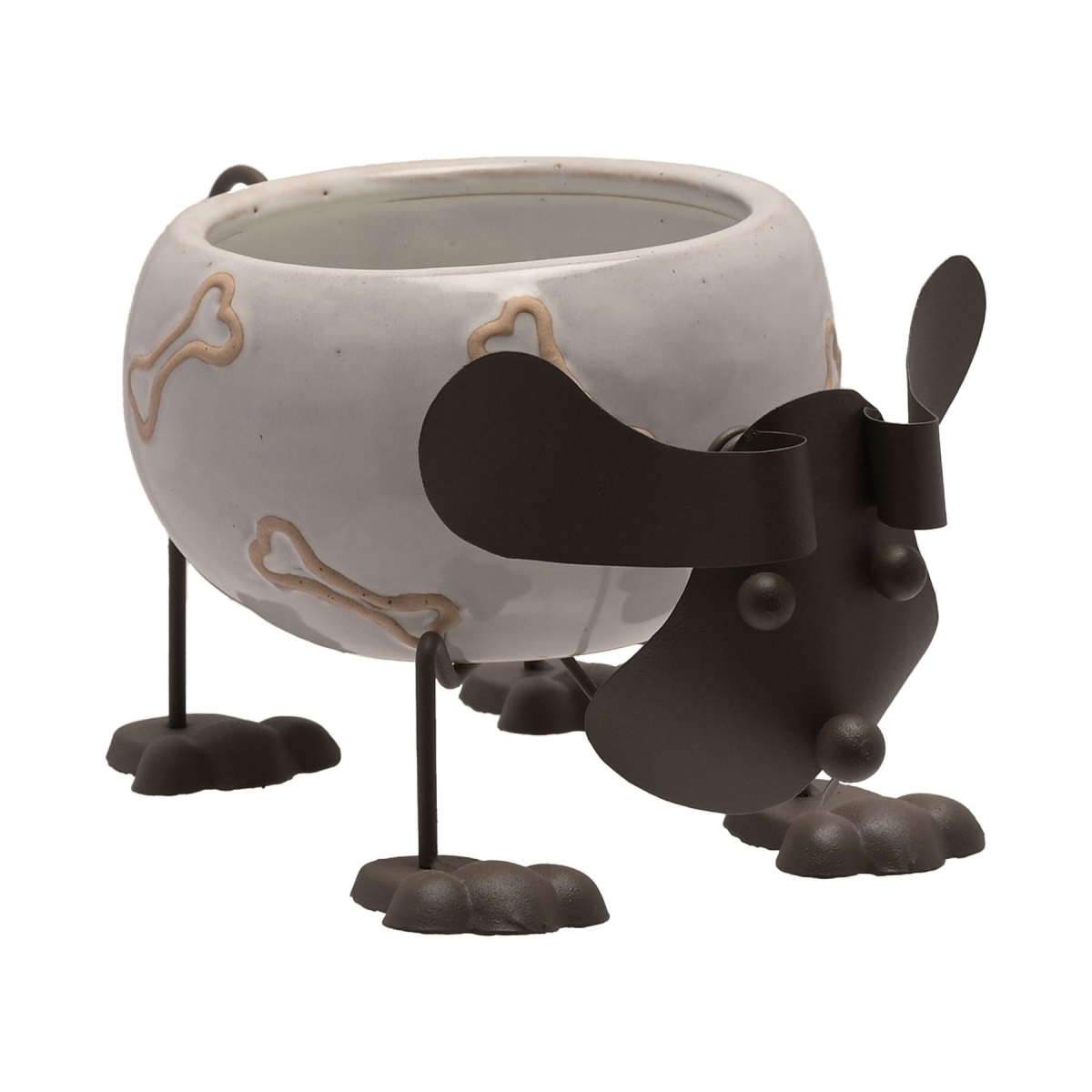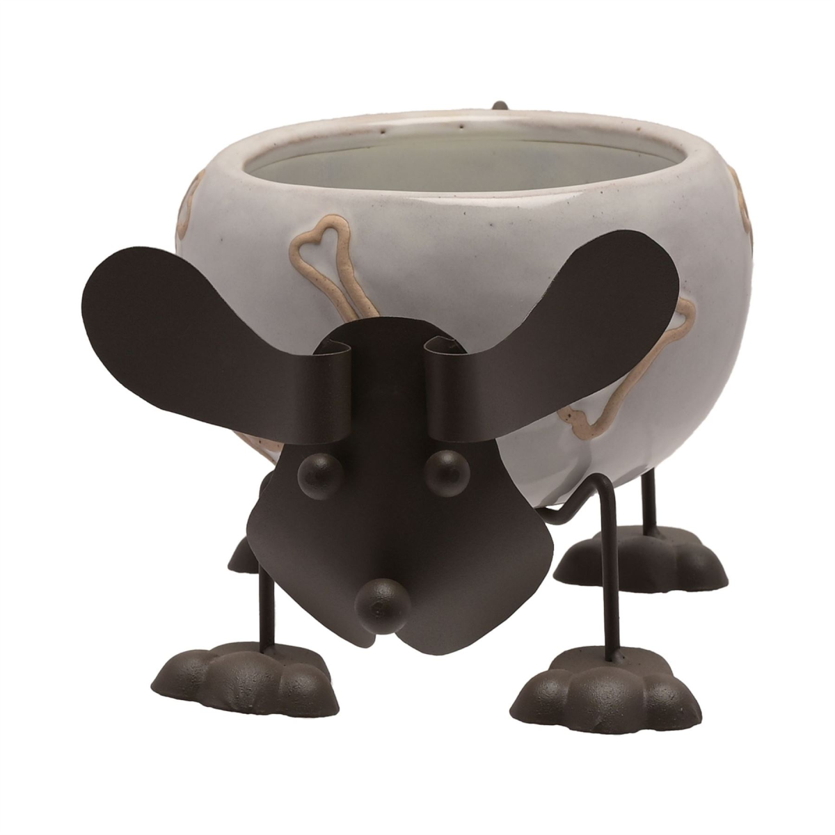 The ceramic planter showcases an adorable dog design, complete with white gloss finish. It is completed by black metal body parts and embossed bone decorations.