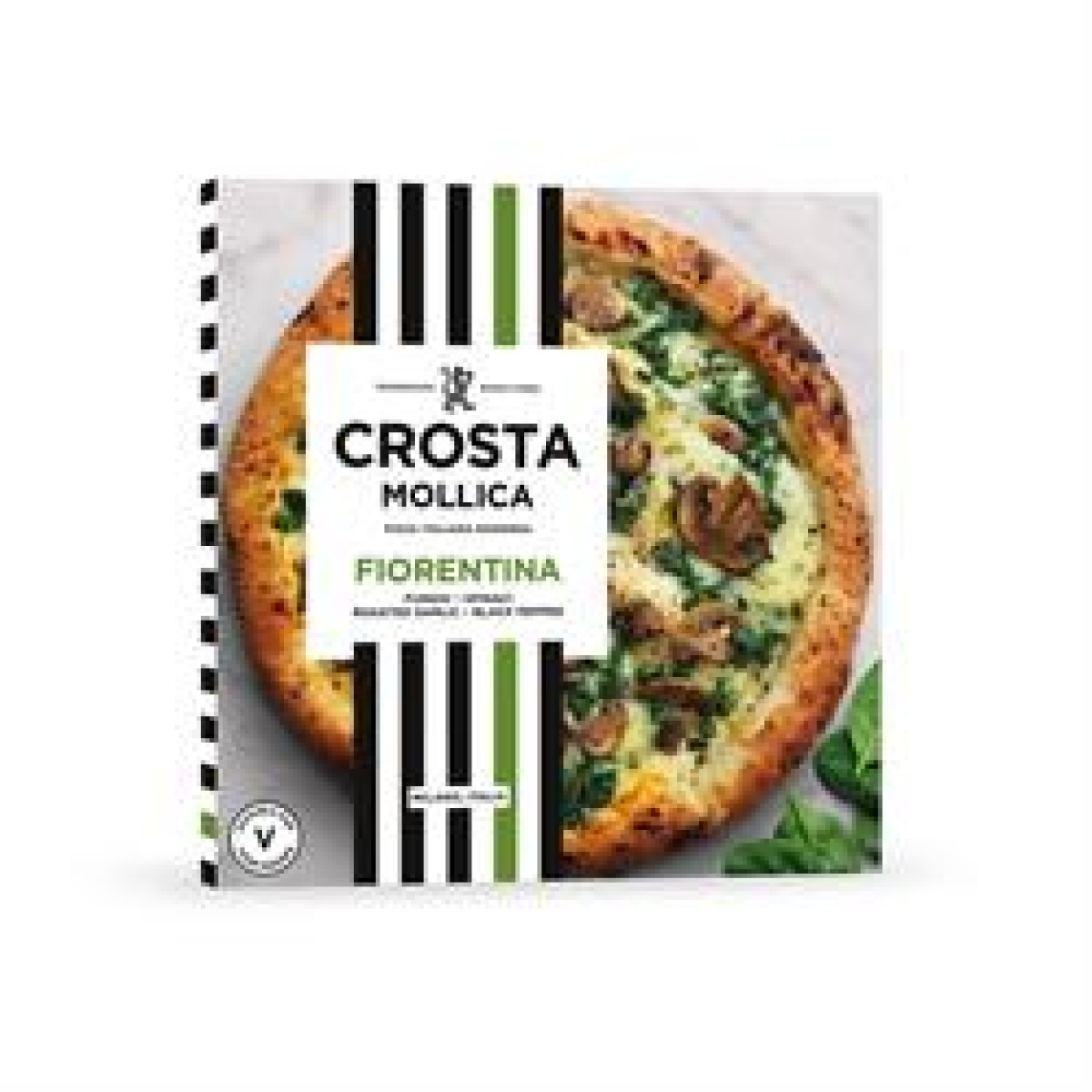 Crosta & Mollica pizza is made in Italy by artisan bakers. The traditional slow-proved sourdough is baked in a wood-fired oven for an authentic pizzeria taste and develops a puffed up, lightly charred crust. Our Fiorentina pizza is a "pizza bianca" and is topped with Mushrooms, spicy Spinach and Mozzarella on a rich Cream and Roasted Garlic Sauce.