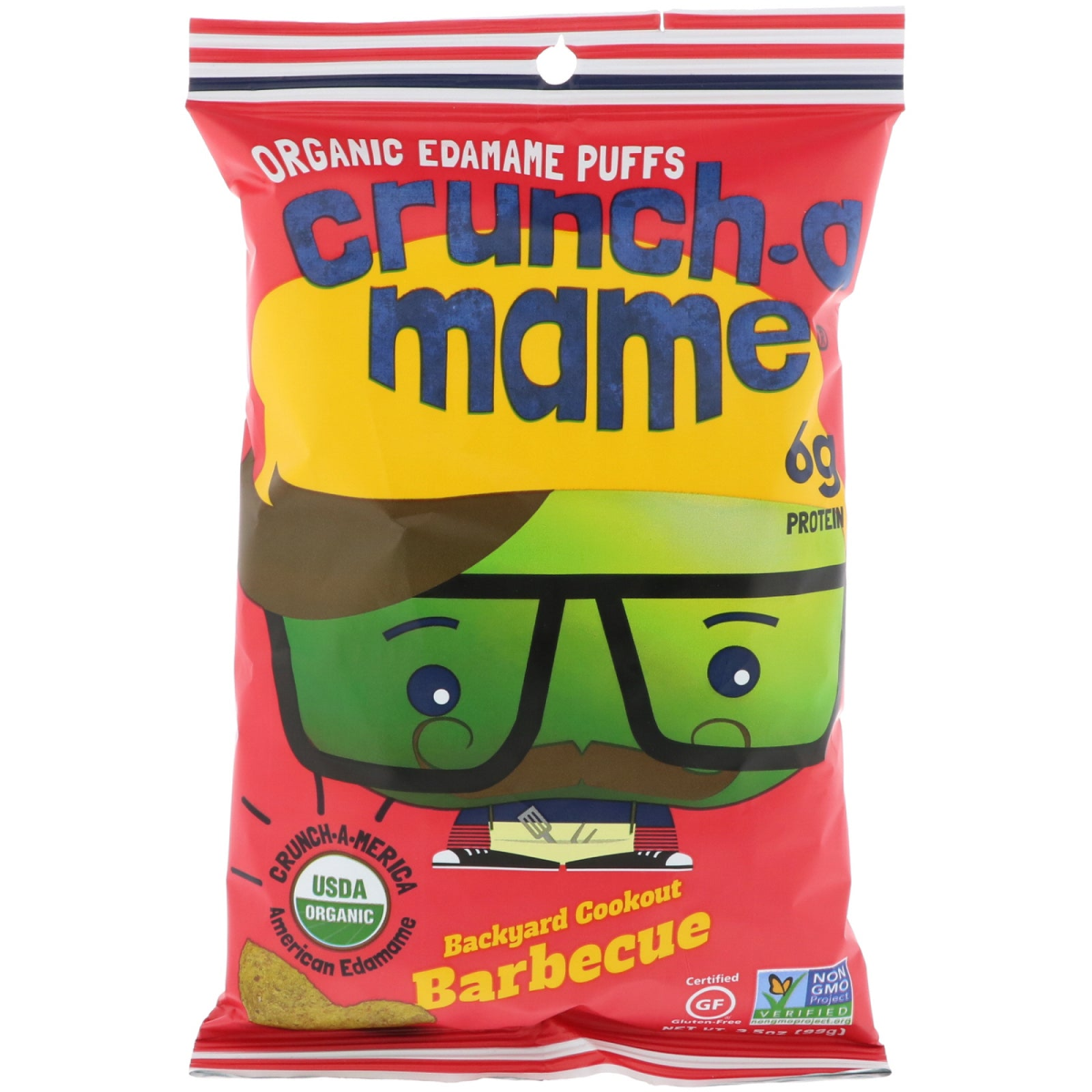 6 g Protein Crunch-A-Merica - American Edamame USDA Certified Gluten-Free Non-GMO Project Verified Under 150 Calories per Serving 2g Fiber per Serving Nutrition with an Attitude Certified by EcoCert ICO Let's go Crunch-a-merica! We unite moms, dads and kids with our , plant-protein packed, crunchy, super tasty, Crunch-a-Mame Puffs made with American-grown edamame. Our edamame is proudly grown in nutrient rich soil by our exceptional and caring farmers on beautiful, verdant farms in the American Heartland. We put families and farmers first we are one Crunch-a-mmunity. Snacking should be fun AND healthy. Remember, your Mame knows best! CRUuuuNCh! What the heck is edamame? Well, its's a really cute, baby soybean that's naturally law in calories, is free of cholesterol and gluten, and is an excellent source of complete plant-based protein, and all sorts of great micronutrients that strengthen your body. Now, aren't you glad you asked? Crunch-a-mame puffs are made from wholesome edamame flour, brown and white rice, spinach, and are seasoned with scrumptious seasonings. No nasty ingredients or protein isolates!