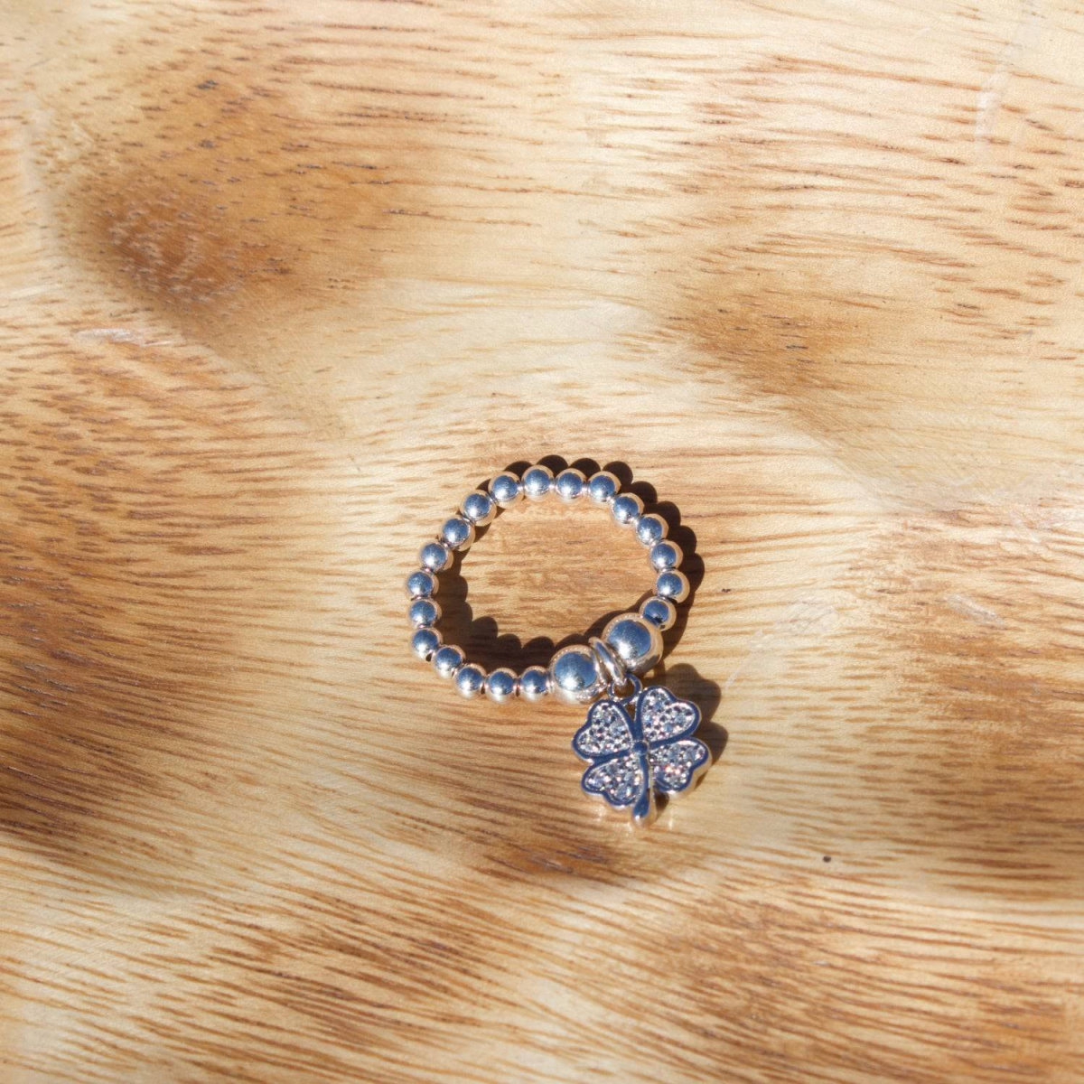 Crystal Four Leaf Clover on Silver Ball Bead Ring