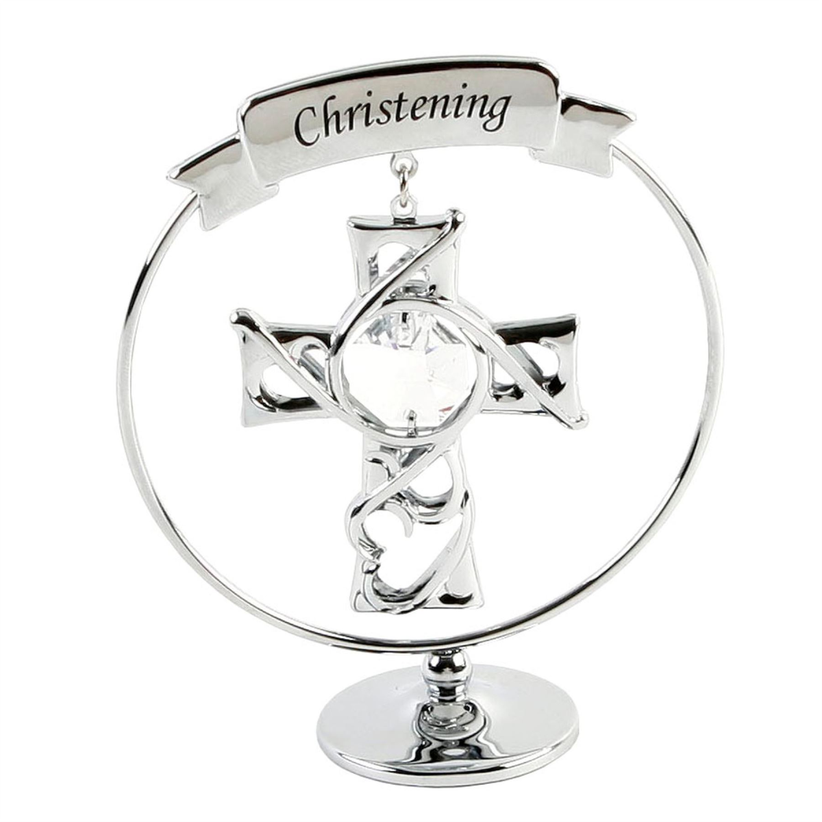 A beautiful, freestanding chrome plated Crystocraft christening ornament. The mobile has a decorative, celtic style cross suspended from a cut out circle frame, embelished with a large, world renowned Austrian Crystals. Complete with 'Christening' banner, this is the perfect gift for this special occasion.