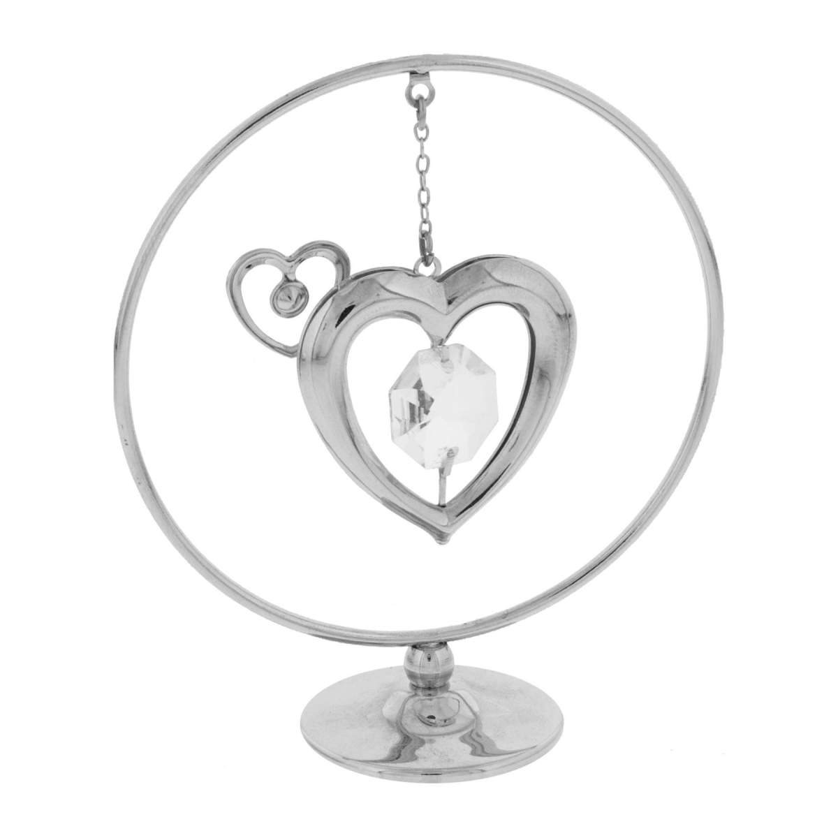 A beautiful, freestanding chrome plated Crystocraft love heart mobile. The decorative love hearts are suspended from a cut out circle frame and embellished with two Austrian Crystals.