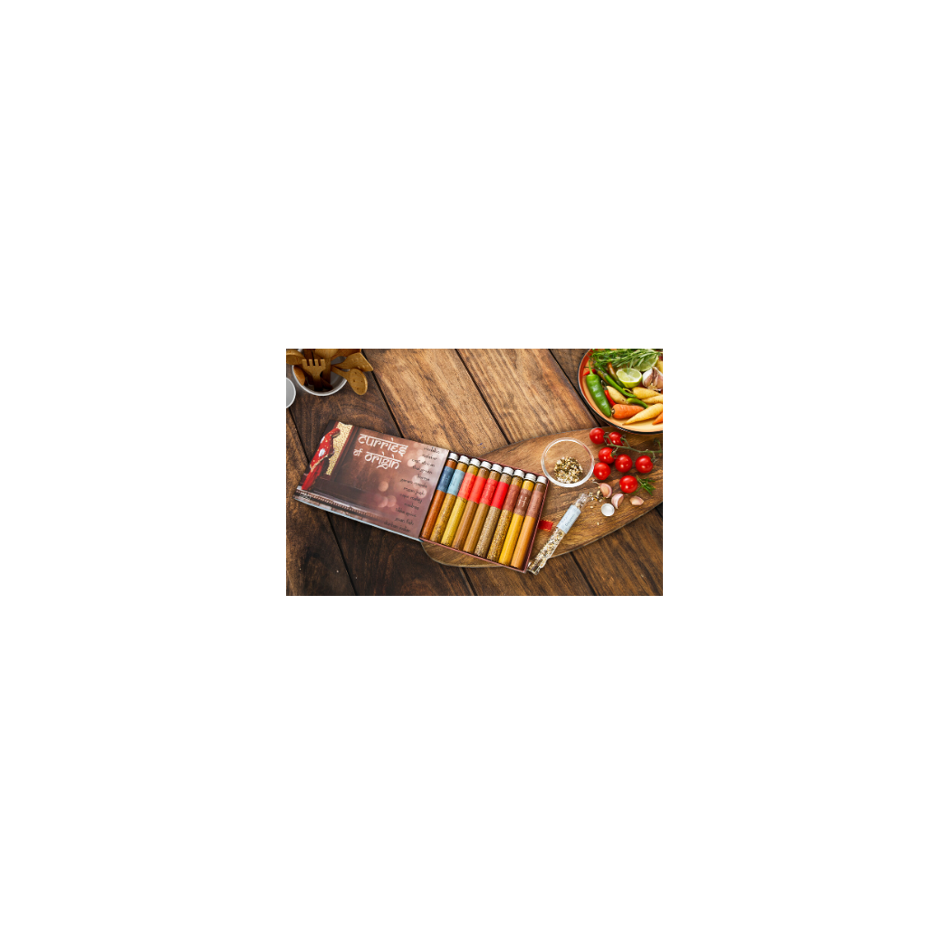 This extraordinary selection box features 12 curry seasonings, showcasing popular Indian spices, as well as African and Asian curry varieties: