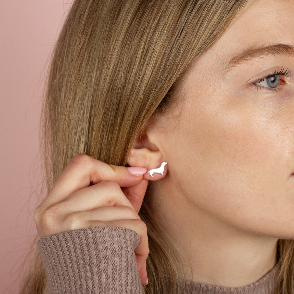 Celebrate your love for Sausage Dogs with our Dachshund stud earrings, a beautifully crafted keepsake designed for dog lovers. These high-quality 925 sterling silver studs feature the distinctive silhouette of these dogs with little legs and a big personality and are guaranteed to brighten your day. A perfect gift for Dachshund owners, dog lovers, or anyone who appreciates sterling silver jewellery.