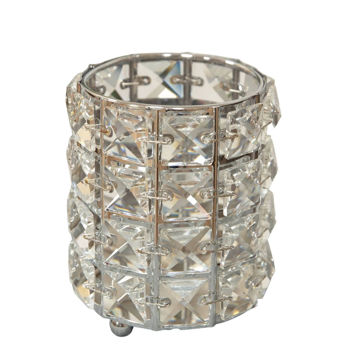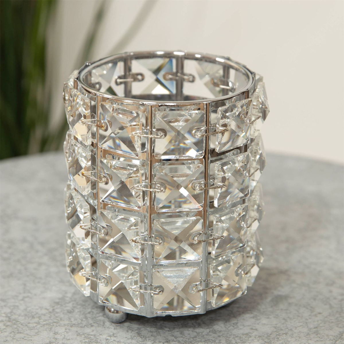 Create a shimmering and glamorous atmosphere at home with this beautiful silver metal and square diamante crystal candle holder. From the HESTIA� Silver Luxe collection - unparalleled glamour, style and elegance in contemporary home and gift. Details: - Cylindrical silver metal frame - Square cut crystal diamantes - Ball bearing style feet - Holds a tealight, votive or up to 3" diameter pillar candle - The perfect home accessory to suit a contemporary glam theme - H:12cm x W:10cm