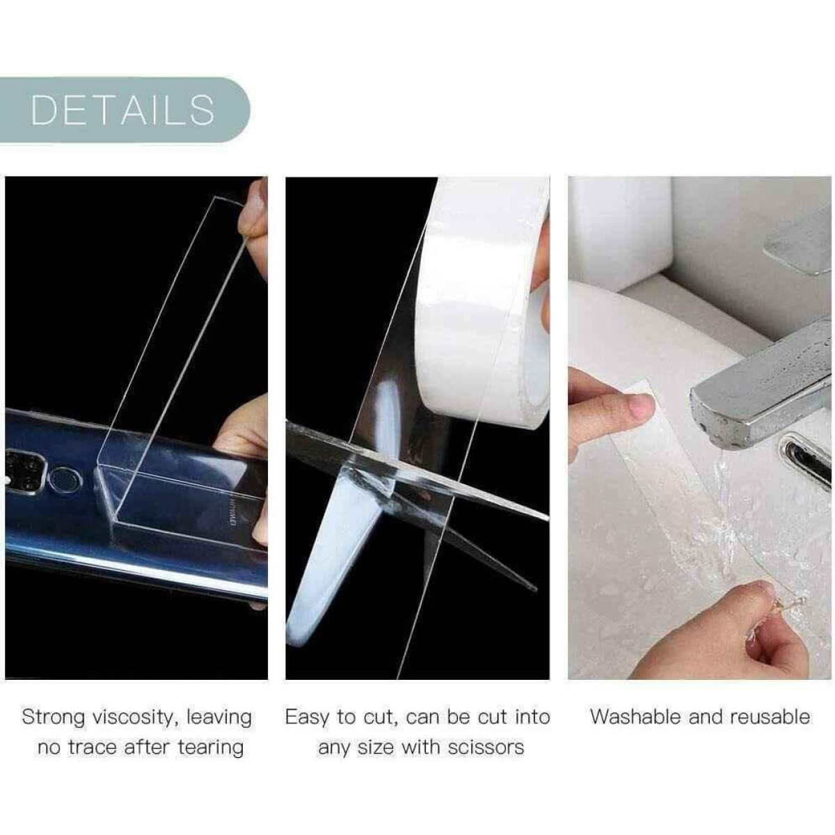 - Washable & Reusable: When nano adhesive tape gets dirty, you can wash it with water. DO NOT use any other wipes or detergent. You just need to wash and dry it to restore the sticky then reuse again.