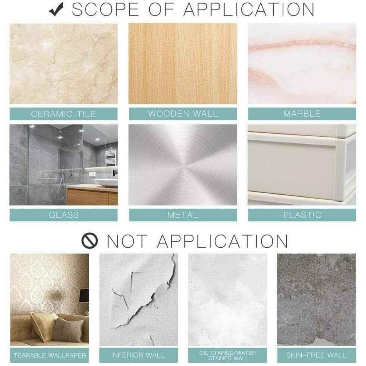 - Strong Viscosity: Don't use our double-sided tape on painted walls, wallpaper, plastered walls and other inferior walls, because of its strong viscosity, it may damage your walls. You can apply it on smooth surfaces like ceramic tile, glass, metal, marble, and plastic.