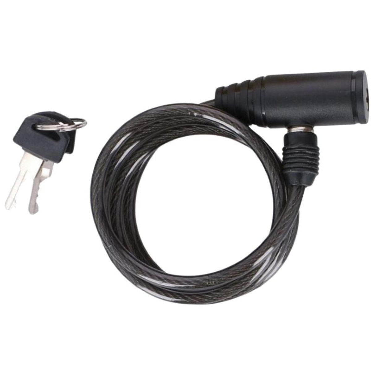Dunlop Bike Lock 0.6x90 cm Black 1049670 Get a Dunlop bike lock and protect your bike from theft. The flexible cable is covered with a plastic sheath. The coiled design resembles a spiral. Closing and opening the lock is hassle-free, simply by unclipping or locking the lock with the key. Technical data: Total lock length approx.: 90 cm Link thickness: 6 mm Material: steel, plastic Lock type: key lock Spare key: yes Packaging dimensions (blister): 11.5 x 3 x 15 cm (W x D x H)