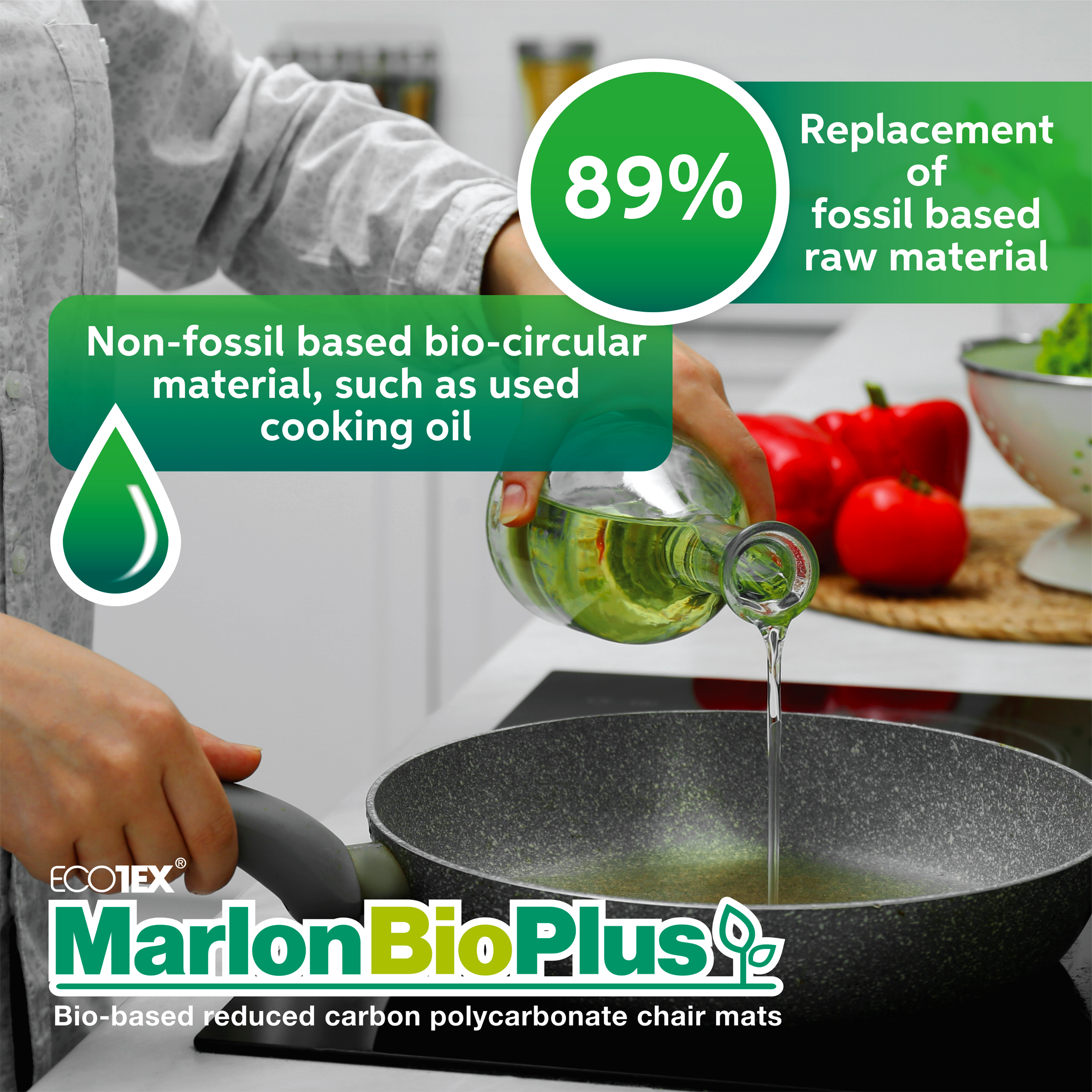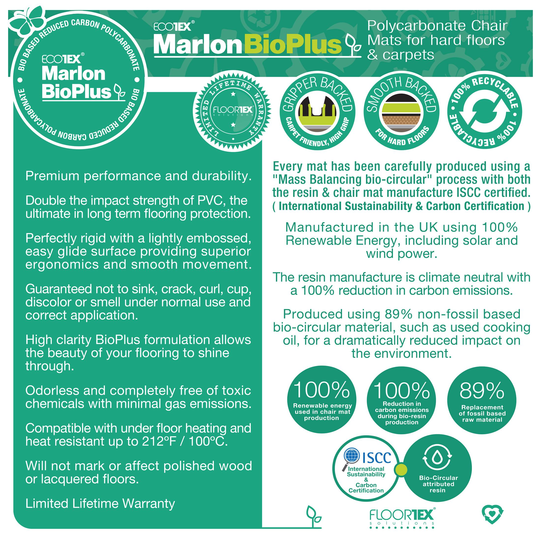 Ecotex Marlon BioPlus Polycarbonate Chair Mats provide the ultimate in quality, function and durability combined with eco-friendly material and manufacture. Produced using a Mass Balancing bio-circular process with both the resin and chair mat manufacture ISCC certified. (International Sustainability & Carbon Certification).