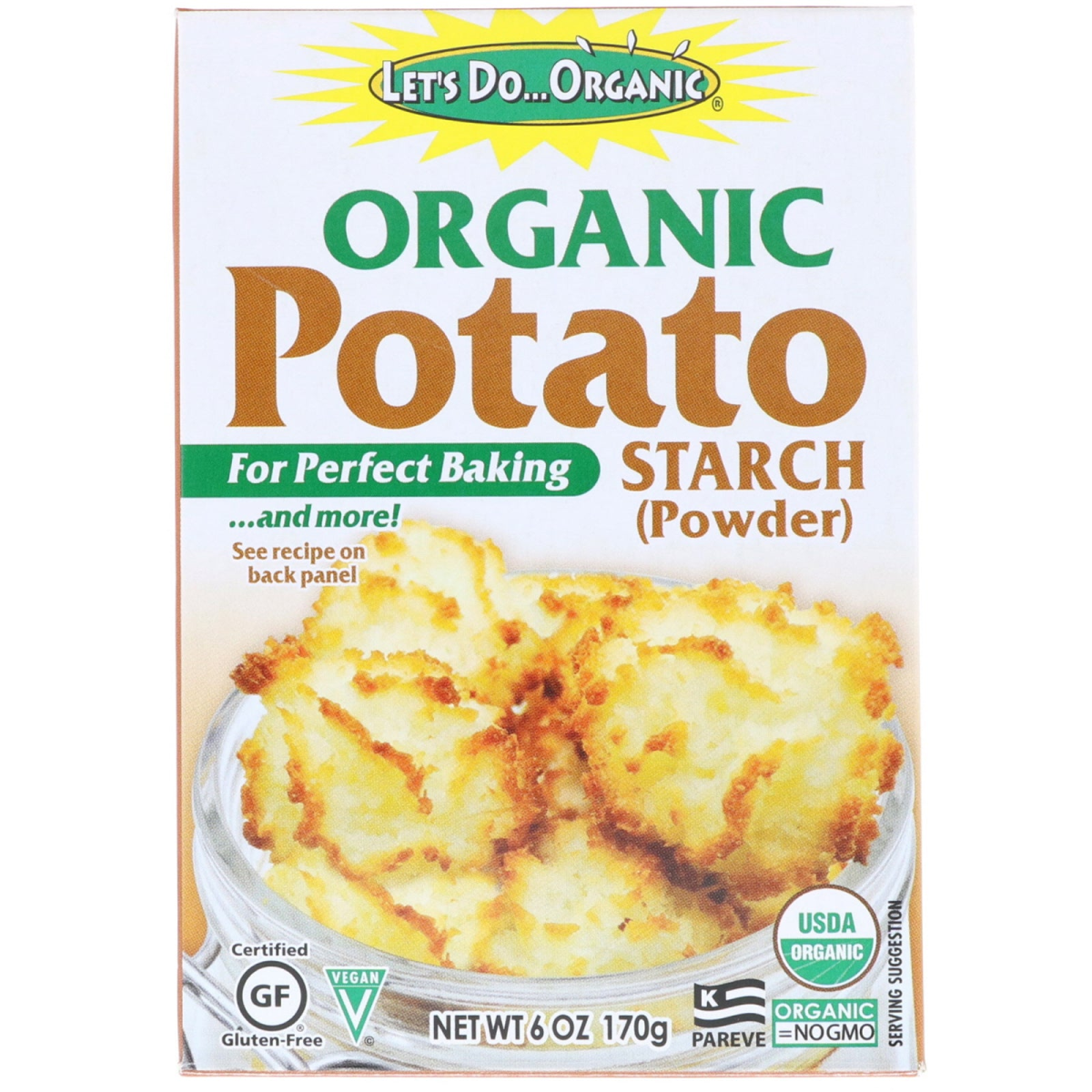 For Perfect Baking...and More! Powder USDA Certified Gluten Free Vegan Kosher Pareve = No GMO Certified by QAI Canada Imported A Family Owned Vegetarian Company Since 1978 Convenience Without Compromise Let's Do... Potato Starch is a versatile gluten free starch, excellent for thickening and baking. It is great in breads, cookies and biscuits. Simply replace other starches one-to-one. For thickening, thoroughly mix 1 part starch with 2 parts water to make a slurry. Stir the slurry into a favorite sauce, gravy or pudding towards the end of cooking, stirring continuously over low heat until the desired thickness is achieved. Potato Starch is a great choice for thickening soups and sauces, as they will retain their intended taste and translucence rather than turning cloudy. Potato starch is prized by chefs of many countries and ethnicities. Native to South America, potatoes have been a source of valuable dietary starch for thousands of years. However you use it, this versatile gluten free starch will serve you well. Enjoy!