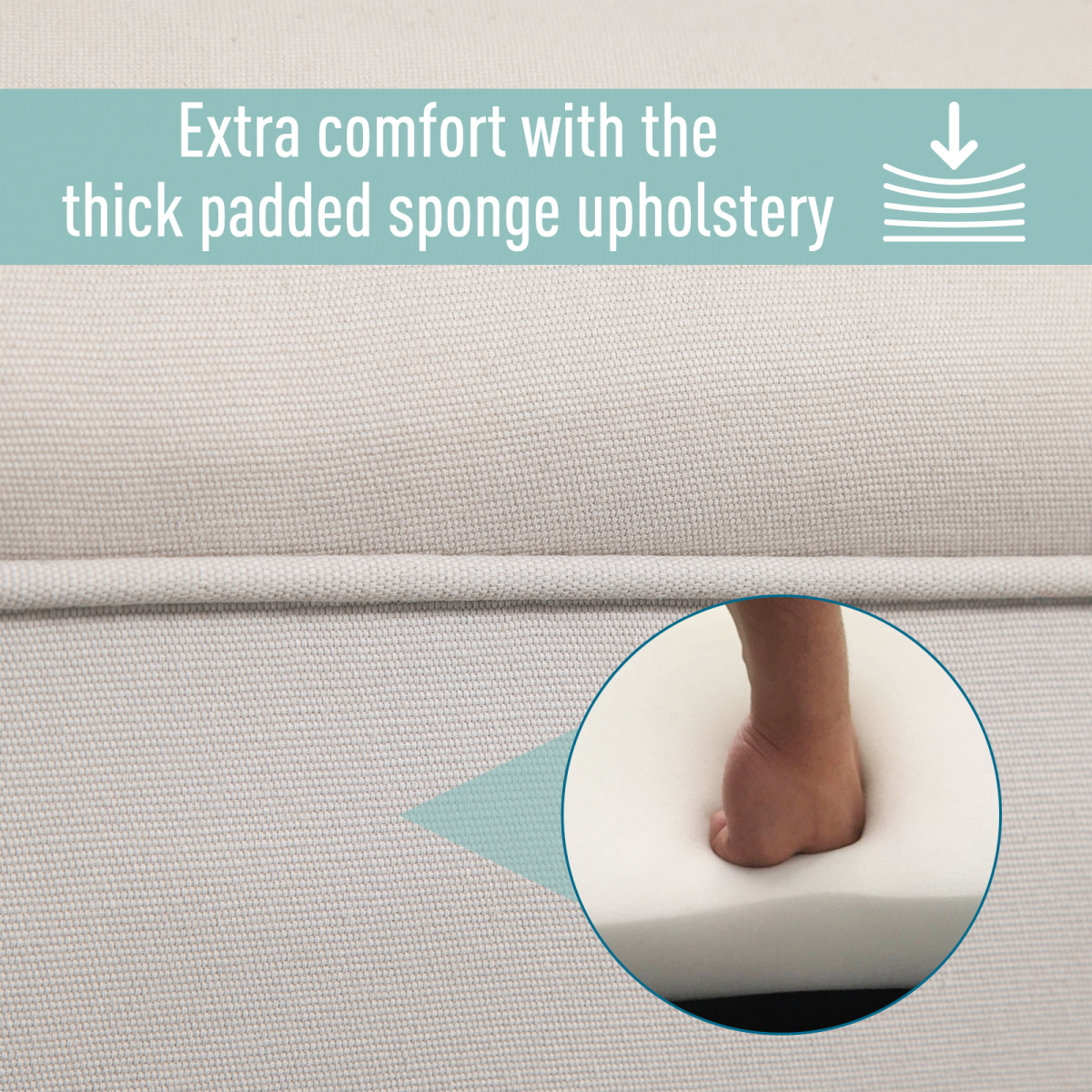 Beautiful Design: Stylish and sophisticated, instantly adds elegance to your bedroom and home. Rolled sides for extra beauty, also prevents you slipping off the edge.Comfortable: Filled with thick foam so you can sit for long periods. Flannelette upholstery is soft to the touch.Wooden Feet: Solid construction, keeps the bench balanced and stable, making it safe and reliable to sit on.Dimensions: 102L x 31W x 51Hcm. Cushion thickness: 17.5cmMAXIMUM LOAD 130KG. ASSEMBLY REQUIRED.