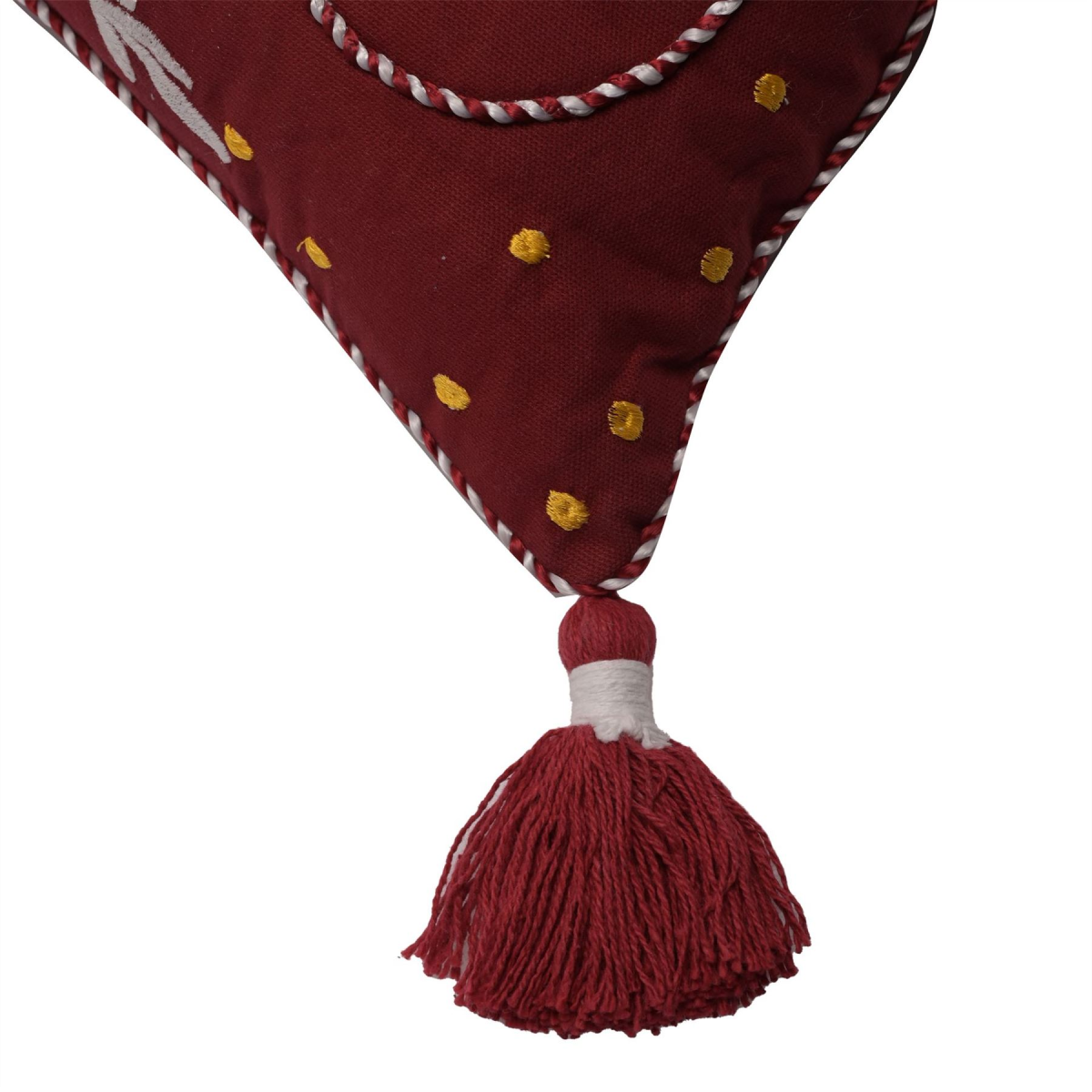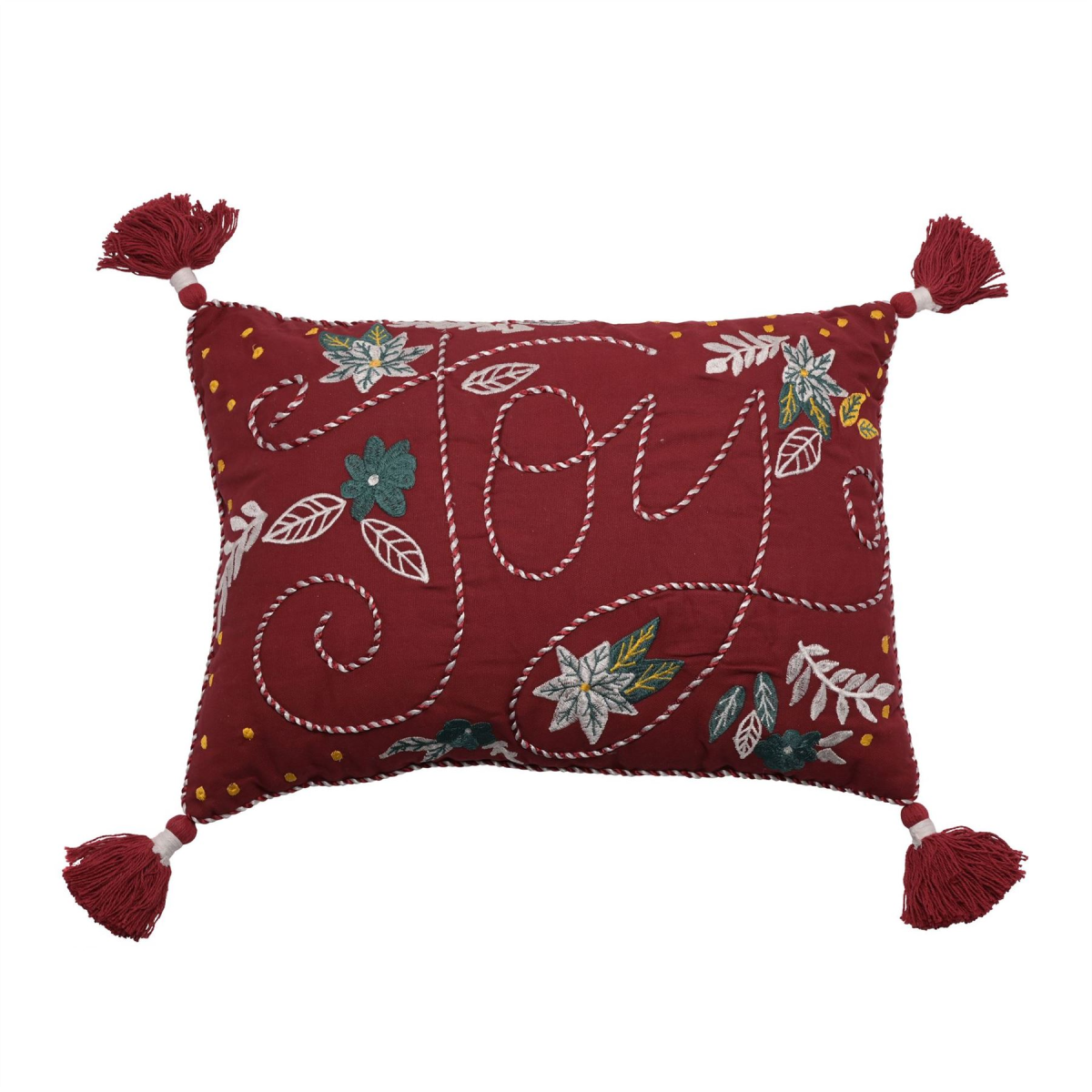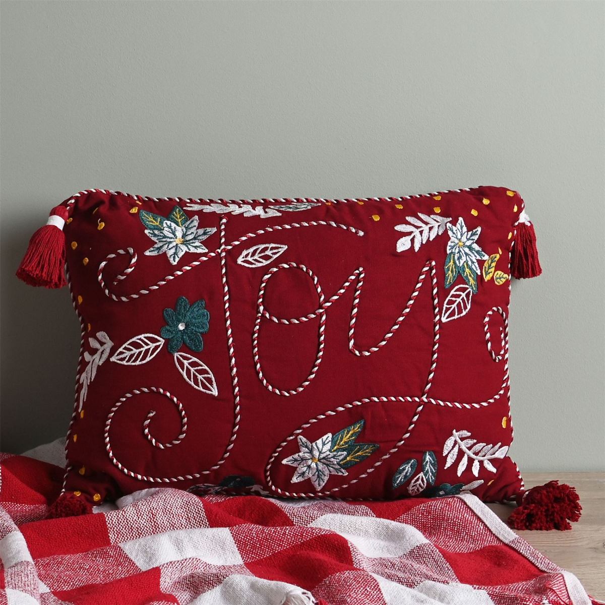 The rectangular fabric cushion showcases bold red colouring on both sides. It is finished by a �candy cane� embroidered �Joy� title across the front, complete with further embroidered floral designs and matching tassels on each corner.