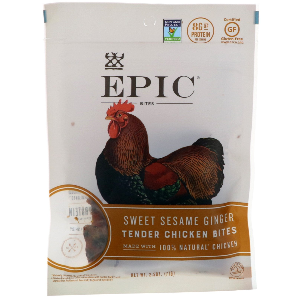 Non GMO Project Verified‡ 8 g of Protein per Serving Certified Gluten-Free Made with 100% Natural* Chicken Inspected for Wholesomeness by U.S. Department of Agriculture No Antibiotics Added No Growth Stimulants** Feed Others as you Wish to Be Fed Epic Epic Bites were created to conveniently feed our inner hunter while staying true to the fundamental principles of consuming wholesome food. As with all Epic foods, the Bites are inspired by the simple yet highly powerful diets of our ancestors. These eating habits have driven human innovation, inspired creativity, and fueled mankind for over 250,000 years of brilliant evolution. Finally, a snack as intended by Mother Nature. Our Sweet Sesame Ginger Tender Chicken Bites are a refreshing and portable snack you will feel good about eating. Our simple yet highly powerful ingredient label hits the palate with semisweet notes of organic currants and further develops into a spicy medley of Asian-Style spices. This artfully crafted Epic snack is tailored to the foodie carnivore who refuses to settle. As with all Epic products, our Bites are inspired by the founding principle of our company: "Feed others as you wish to be fed." * Minimally processed. No artificial ingredients. ** Federal regulations prohibit the use of growth stimulants in chicken. ‡Chicken raised & fed a diet in compliance with the Non-GMO Project Standard for avoidance of genetically engineered ingredients.