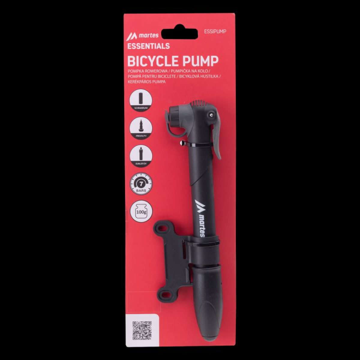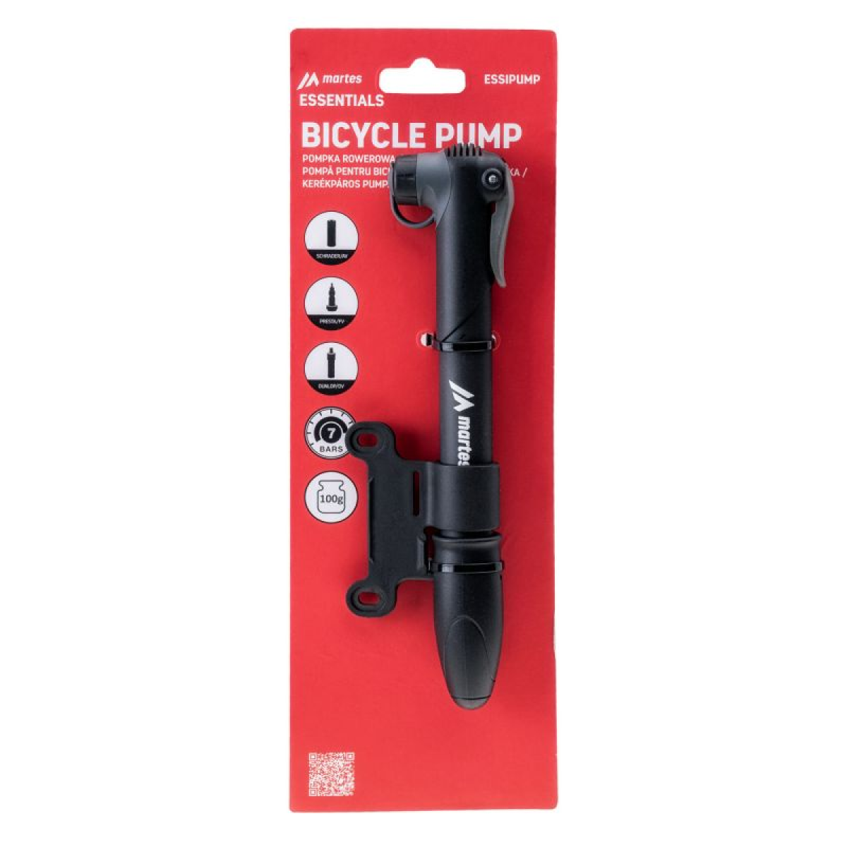 BIKE PUMP SIZE (AFTER FOLDING): 225 x 21 mm WEIGHT: 100 g MATERIAL COMPOSITION: PLASTIC, STEEL SPECIFICATION: - UP TO 7 BAR - POSSIBILITY OF CONNECTING TO ALL TYPES OF VALVE (PRESTA, DUNLOP)