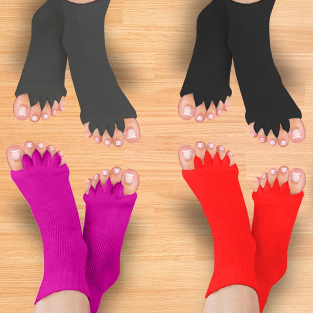 These foot alignment socks are designed to relieve foot pain caused by jogging, standing, tight shoes or bunions; one size fits all.