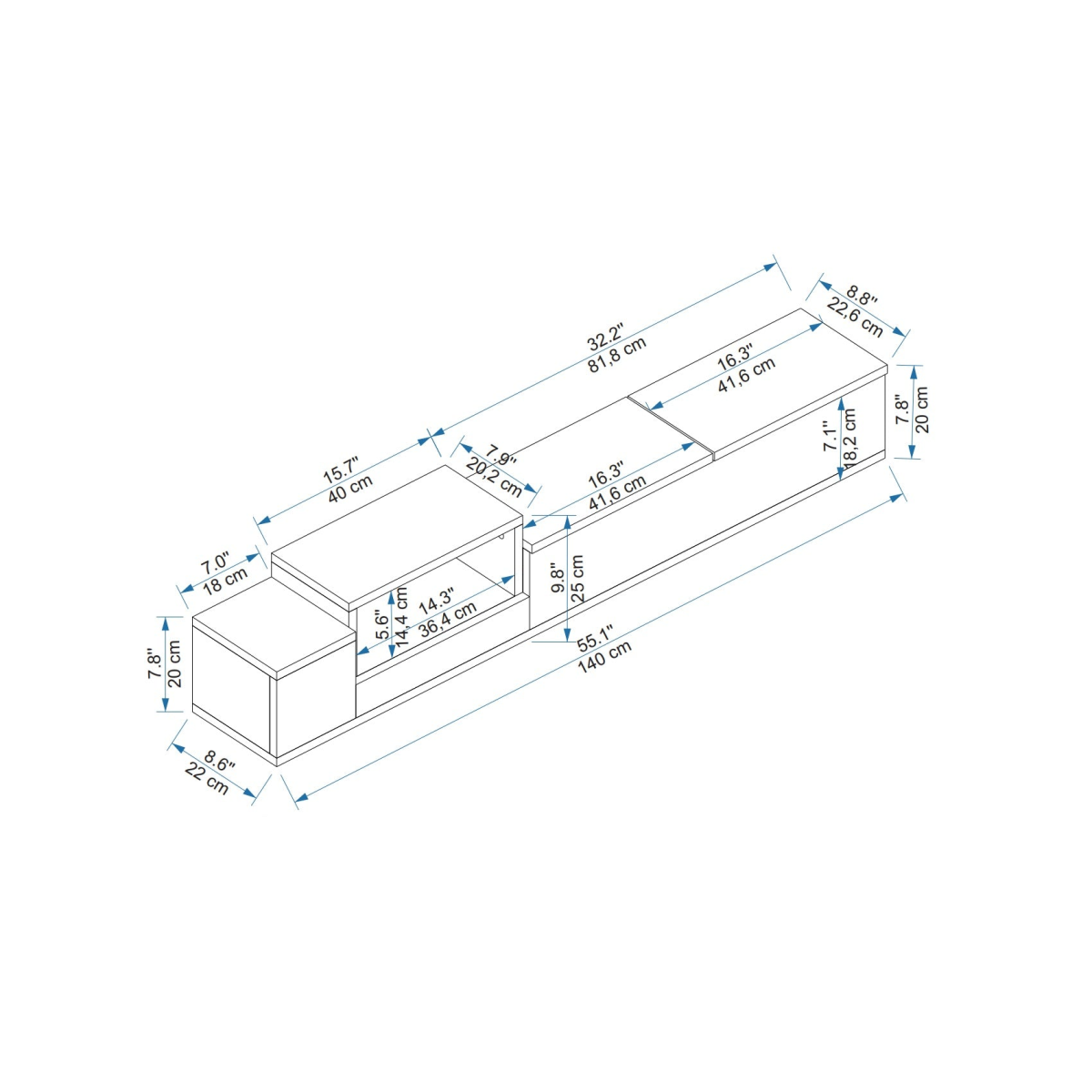 HEIGHT: 8.2" / 21 cm | WIDTH: 55.1" / 140 cm | DEPTH: 8.2" / 21 cm.