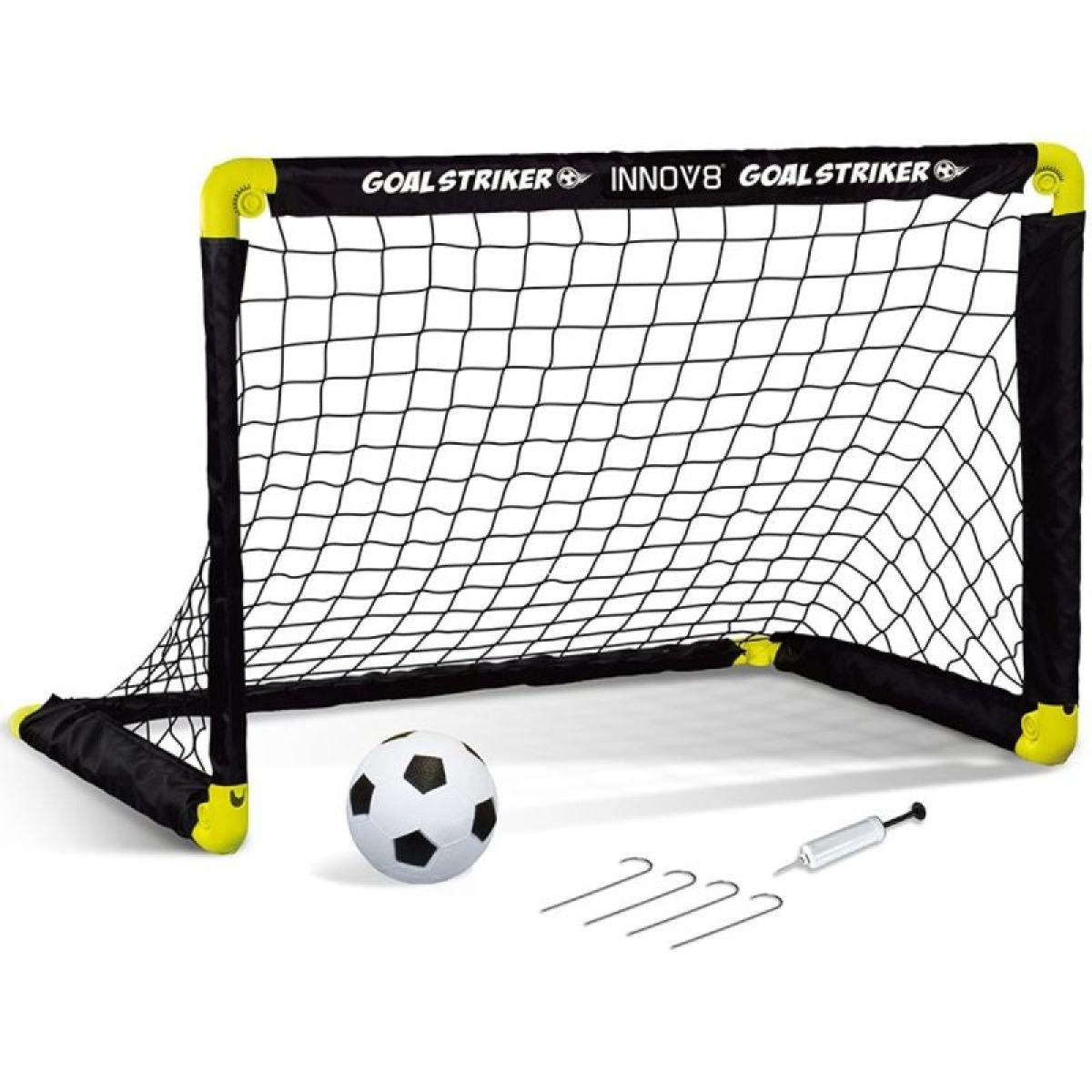 - The set includes: foldable goal, 4 pegs, ball, pump