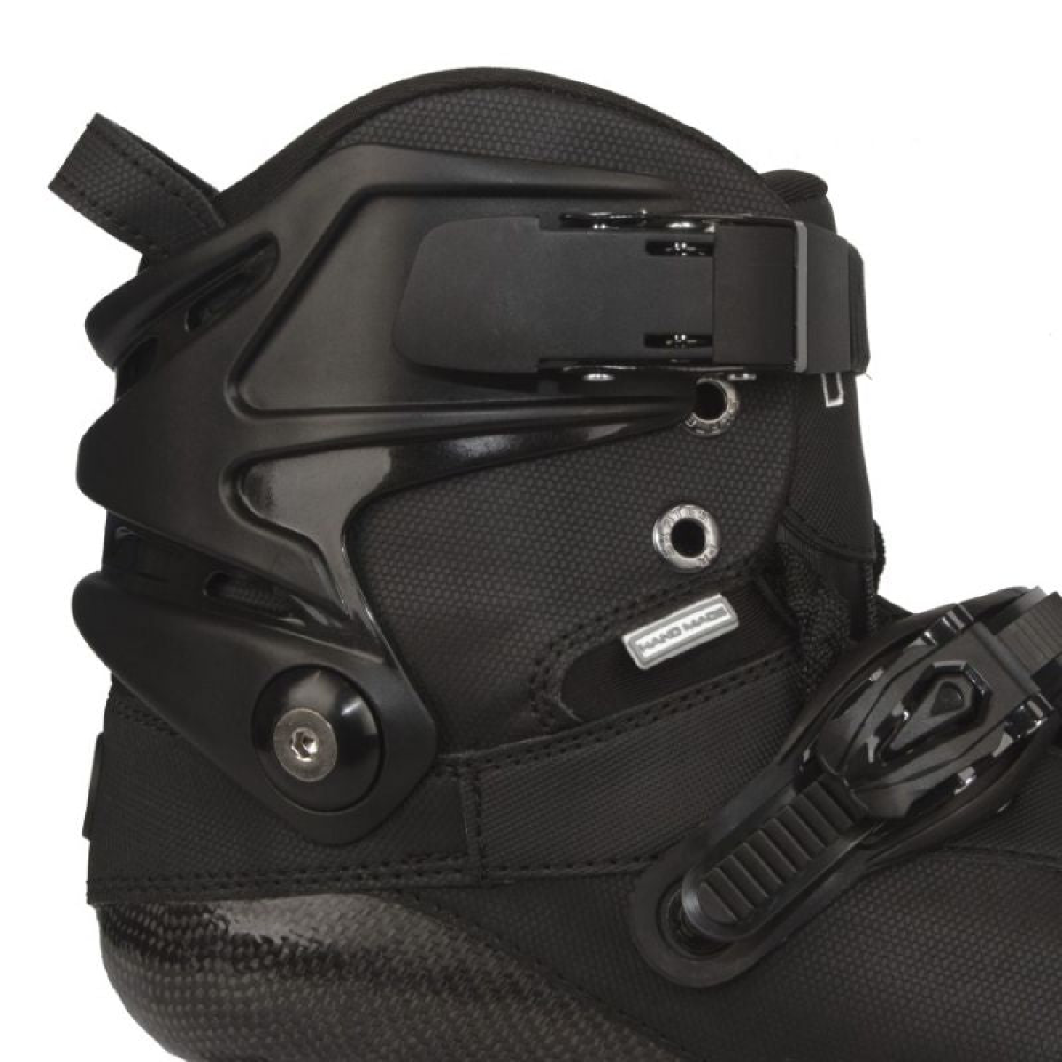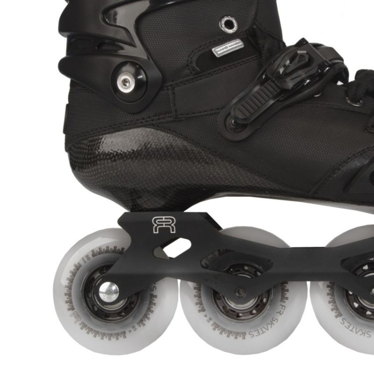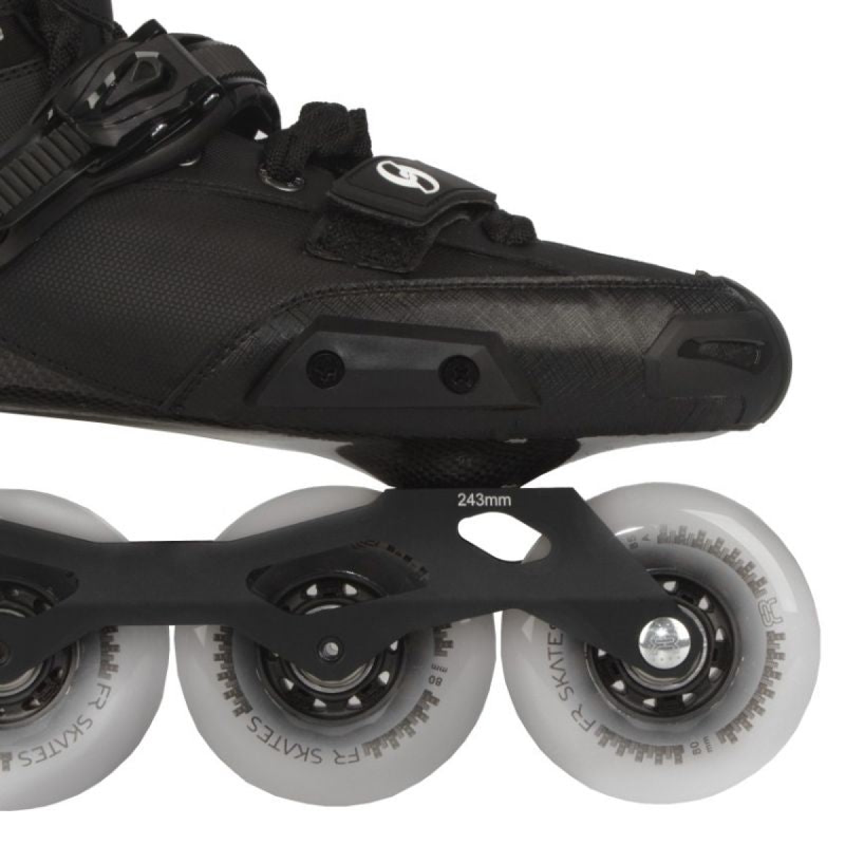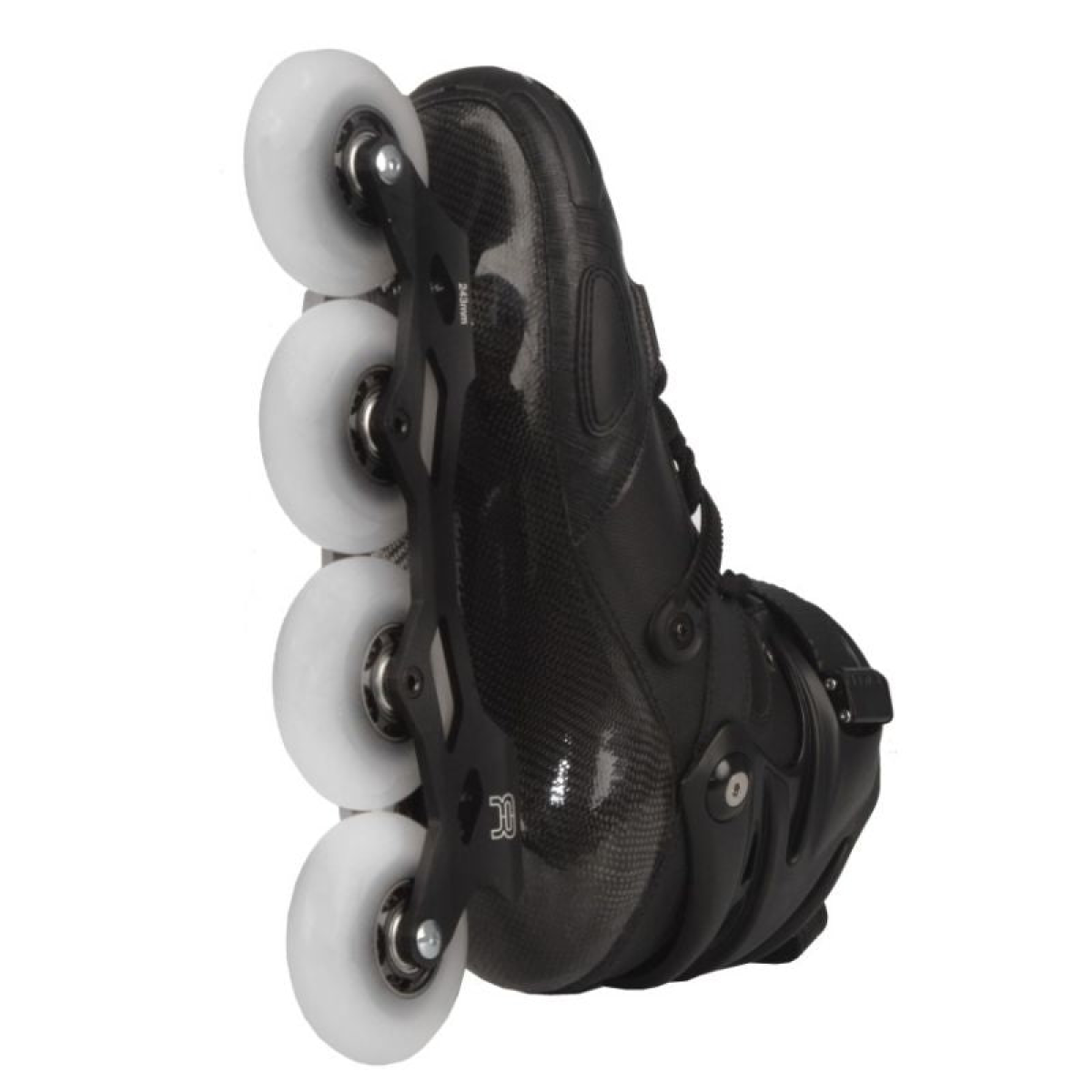 • Boot: Shell made of carbon and glass fibers. It has been made in such a way as to best fit the anatomy of the user, literally immobilizing the foot inside. After correctly tying and fastening these skates, we get a degree of control and precision in translating movements that is in no way inferior to more expensive models. Under the foot, there is an insert that supports the arch of the foot, making the ride more comfortable, and the transfer of pushing energy to the wheels more efficient. The shoe is trimmed with a durable material, and the points that wear out the fastest, i.e. the sides (outside) and the tip, are additionally protected with abrasion-resistant plastic covers.