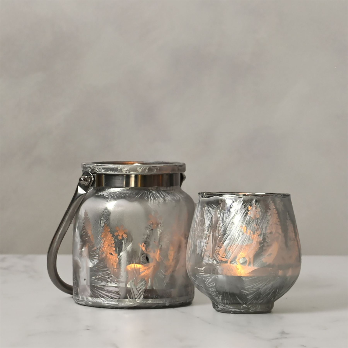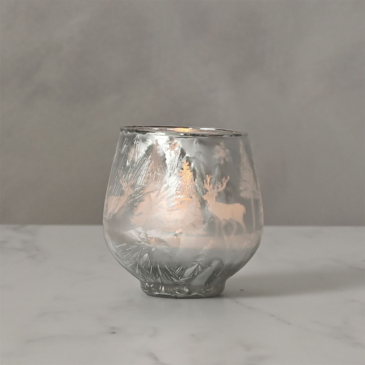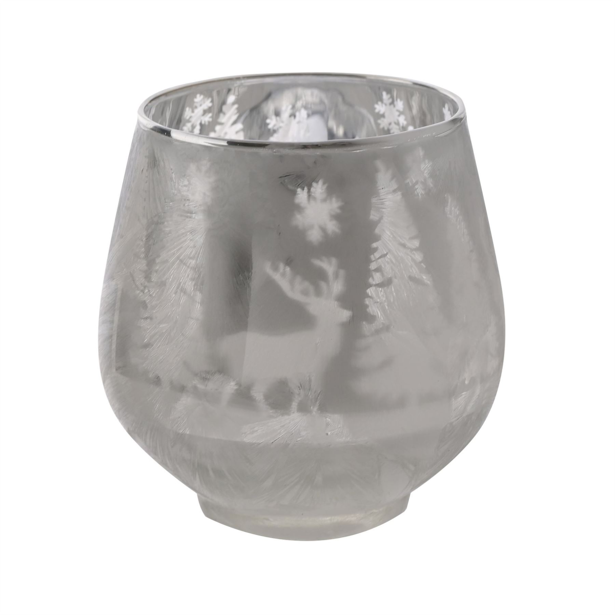 A frosted reindeer forest scene votive candle holder by THE SEASONAL GIFT CO�. This enchanting candle holder glistens with festive charm throughout the Christmas period. The shiny glass candle holder showcases gorgeous silver colouring and a frosted forest scene, complete with reindeer. It provides ample room for a tea light or small candle of choice. The holder is packaged in a brown box.