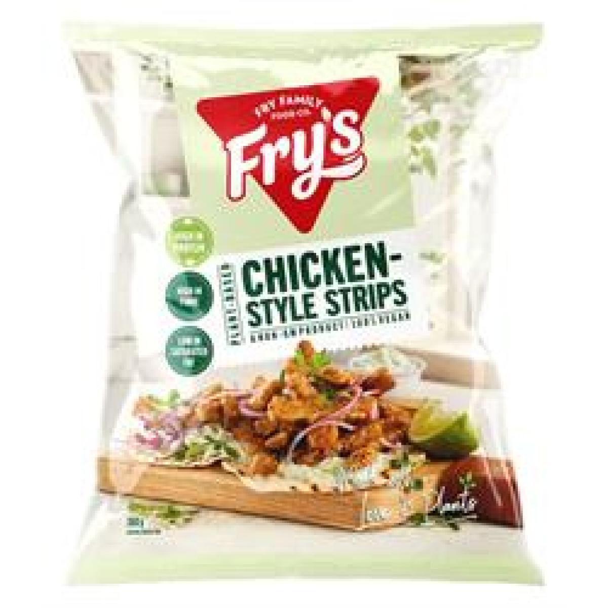 Slender cut vegan chicken-style strips made from vegetable protein and authentically seasoned - ideal for wraps, salads, pies, sandwiches, stir-frys and curries.