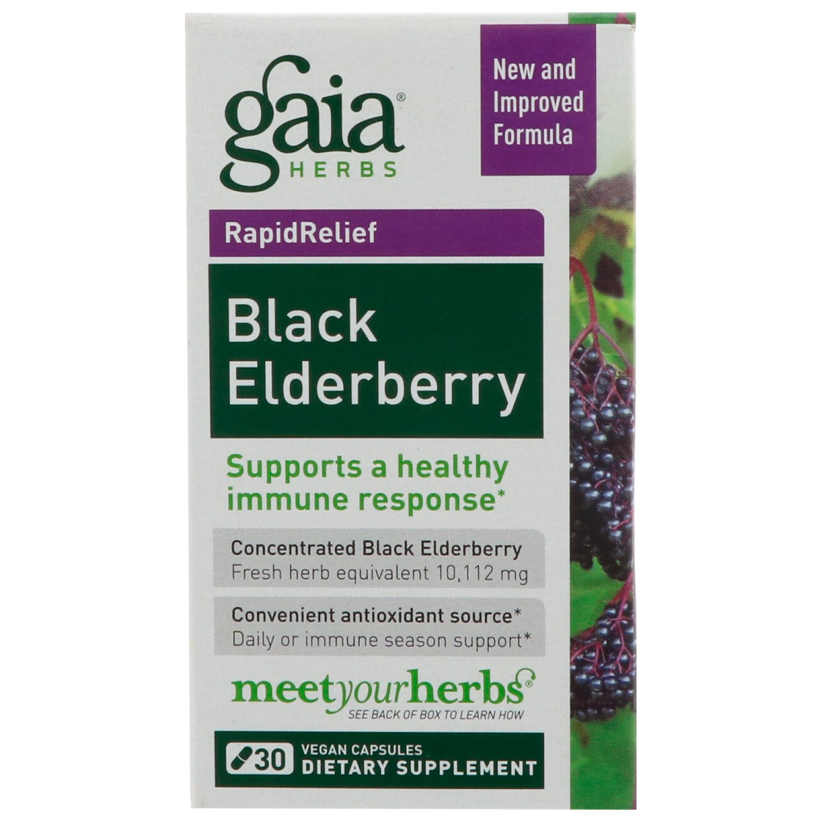 Plant Intelligence Supports a Healthy Immune Response Rapid Relief Dietary Supplement Concentrated Black Elderberry - Fresh Herb Equivalent 10,112 mg Convenient Antioxidant Source - Daily or Immune Season Support Black Elderberry Black Elderberry helps maintain a healthy immune response. Black Elderberry is unique in providing both antioxidant and immune support due to its natural concentration of Anthocyanins and other Flavonoids. The Black Elderberry product is just as concentrated as our best-selling syrup, in the convenience of a capsule for immune support on the go. Made with Black Elderberries and Acerola fruit for synergistic immune support, this product contains no sweeteners or fillers. The Gaia Difference 100% Vegan and Gluten-Free – Easily digestible plant-derived capsule. Laboratory-Tested for Purity – Free of heavy metal toxicity.
