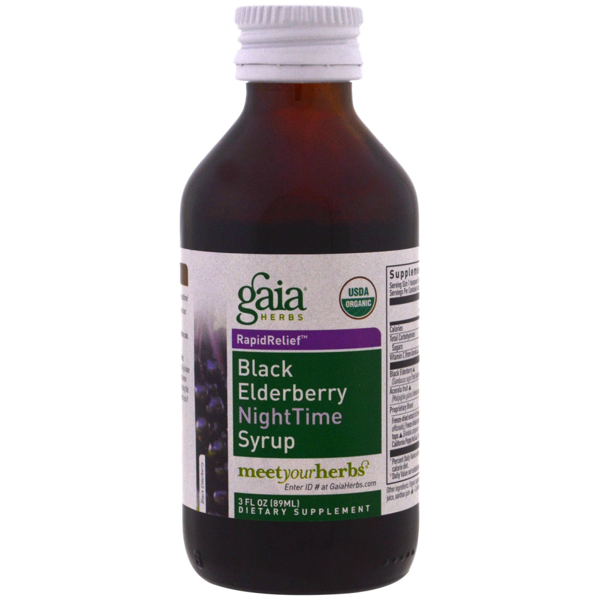 USDA Organic Rapid Relief For Immune Support & Restful Sleep Best-Selling Formula With Herbs to Gently Promote Rest Dietary Supplement Certified Organic by Oregon Tilth Meet your Herbs Meet Your Herbs is the world's only traceability program for therapeutic herbal supplements. Purity: Trace the origin of each herbal ingredient-where and how it was grown. Integrity: View the Certificate of Compliance and test results for this product. Potency: See validation of each herb's full phytochemical complex. Black Elderberry NightTime Syrup For centuries Black Elderberries have been recognized for supporting the immune system. Gaia Herbs’ best-selling Black Elderberry NightTime Syrup super-concentrates the juice from 14.5 grams of organic Elderberries into a single teaspoon. Another important aspect of optimal health is restful sleep. Black Elderberry NightTime Syrup contains the organic herbs Lemon Balm and California Poppy to gently support a good night of rest. Our Black Elderberry NightTime Syrup also contains organic Acerola Cherry fruit extract, making it a delicious and rich source of Vitamin C. A Partnership of Mutual Belief Black Elderberry NightTime Syrup is produced in Tuscany, Italy by Aboca, the herbal supplement leader in more than 25,000 European pharmacies and health food stores since 1978. Gaia Herbs' partnership with Aboca is born from a mutual belief in sustainable product development, dedication to quality, and a deep respect for science and nature working in harmony.