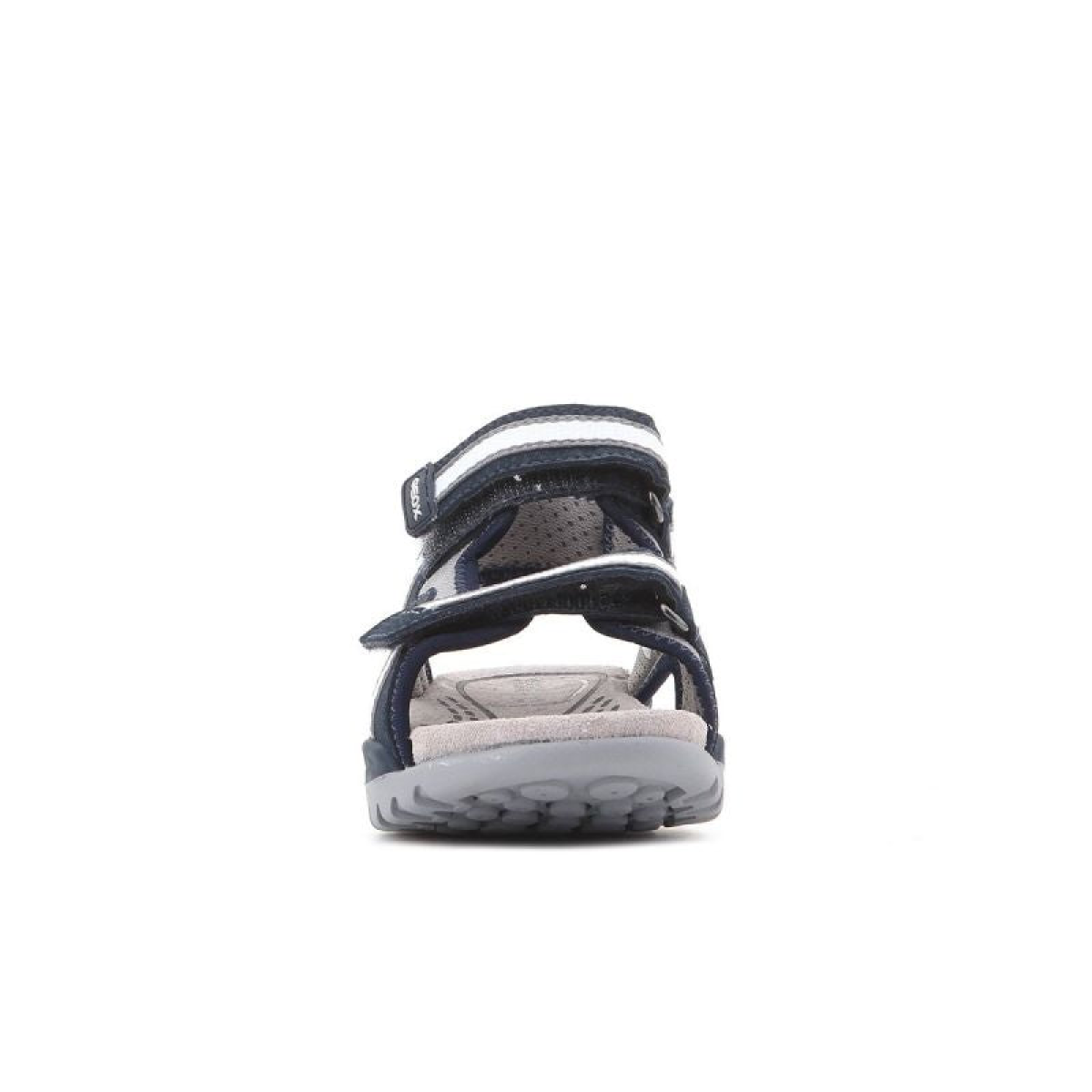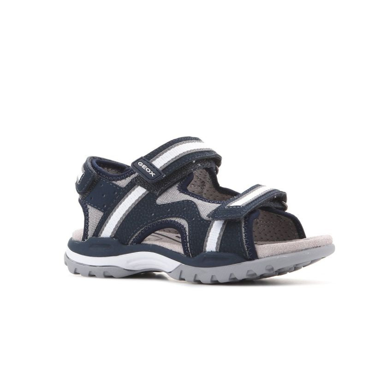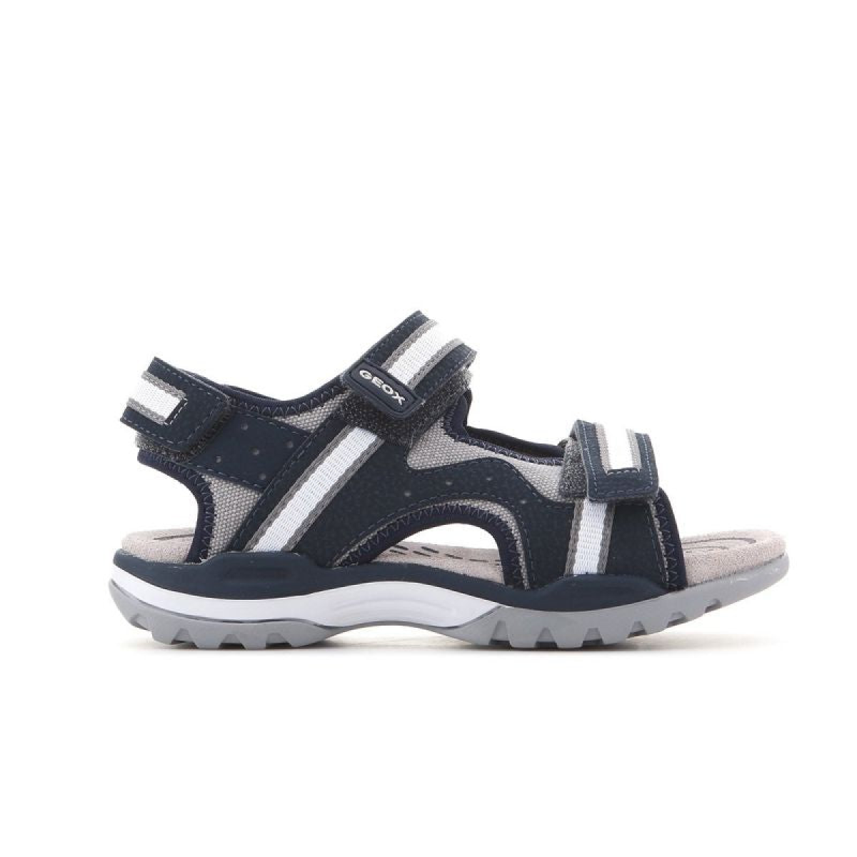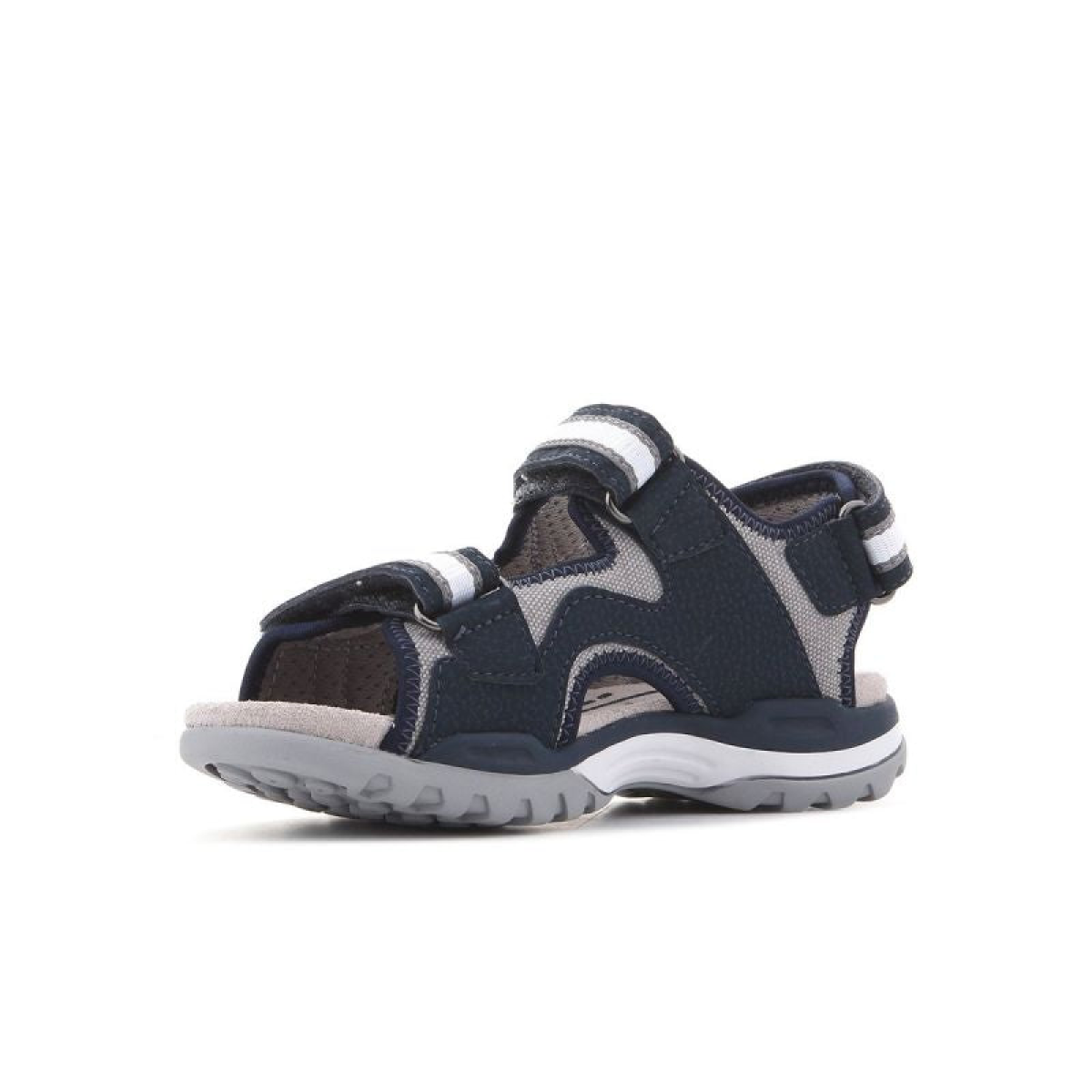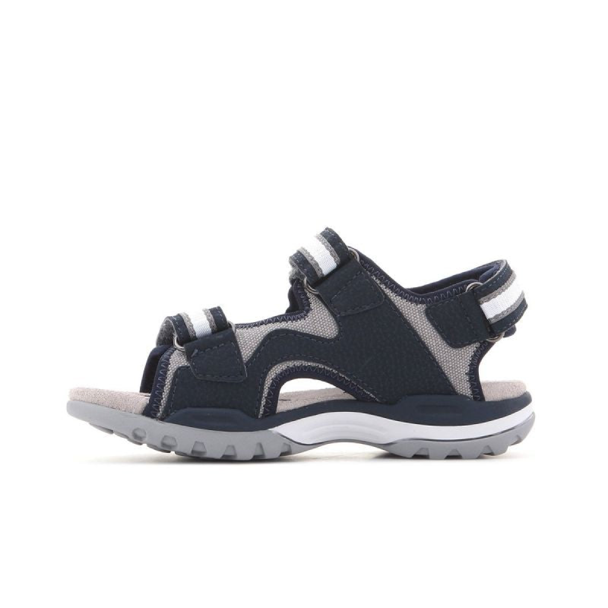 Beautiful and practical summer footwear for little ones. The navy-blue and gray upper, fastened with two Velcro straps, is made from a combination of synthetic and textile materials. White inserts on the upper give the footwear a nautical style. An adjustable heel strap allows you to customize the fit. The leather insole. The sole features a rounded lug tread. Geox Respira - a perforated sole that absorbs and expels sweat without allowing water to enter the shoe. The foot remains dry and at the right temperature.