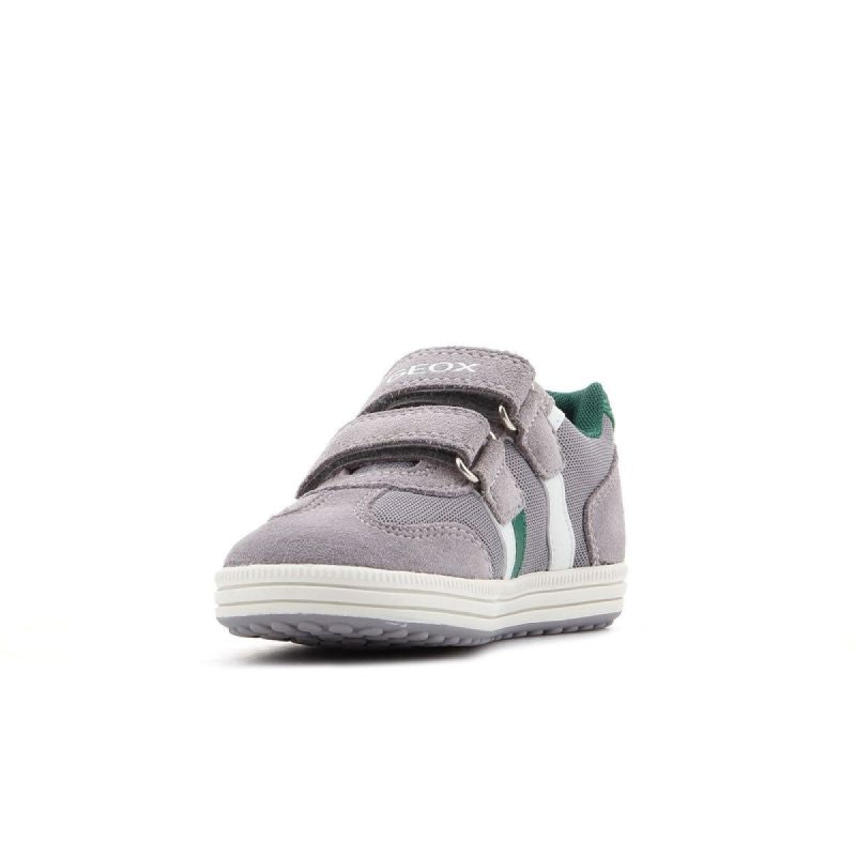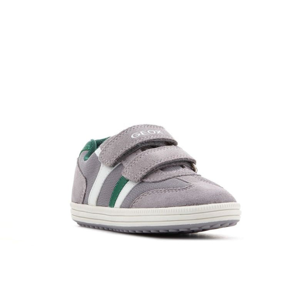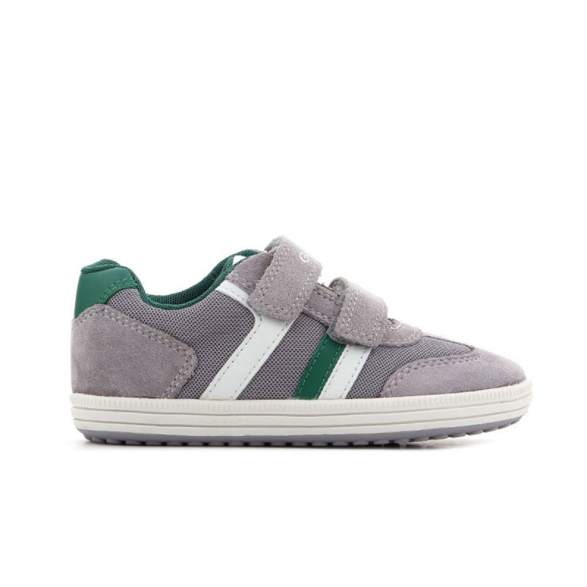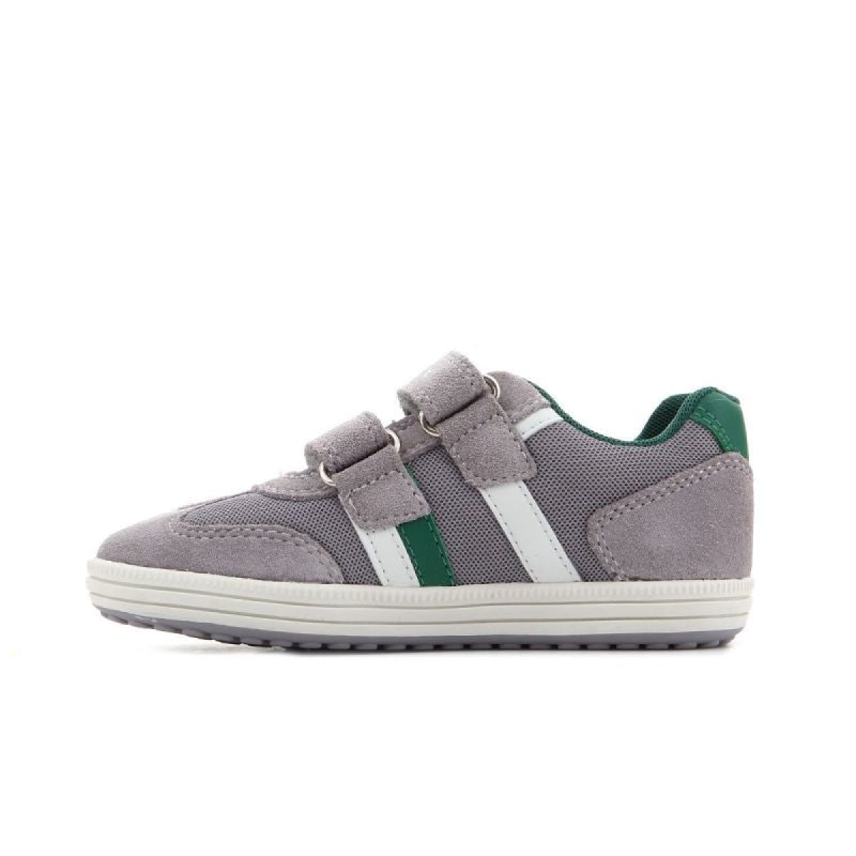 Children's shoes by Geox. The upper, fastened with two Velcro straps, is made of a combination of suede and textile. The shoe's ash-gray color is accented by green and white inserts. The antibacterial leather insole and the high-quality synthetic sole meet the needs of developing feet. Geox Respira - a perforated sole that absorbs and expels sweat without allowing water to enter the shoe. The foot remains dry and at the right temperature.