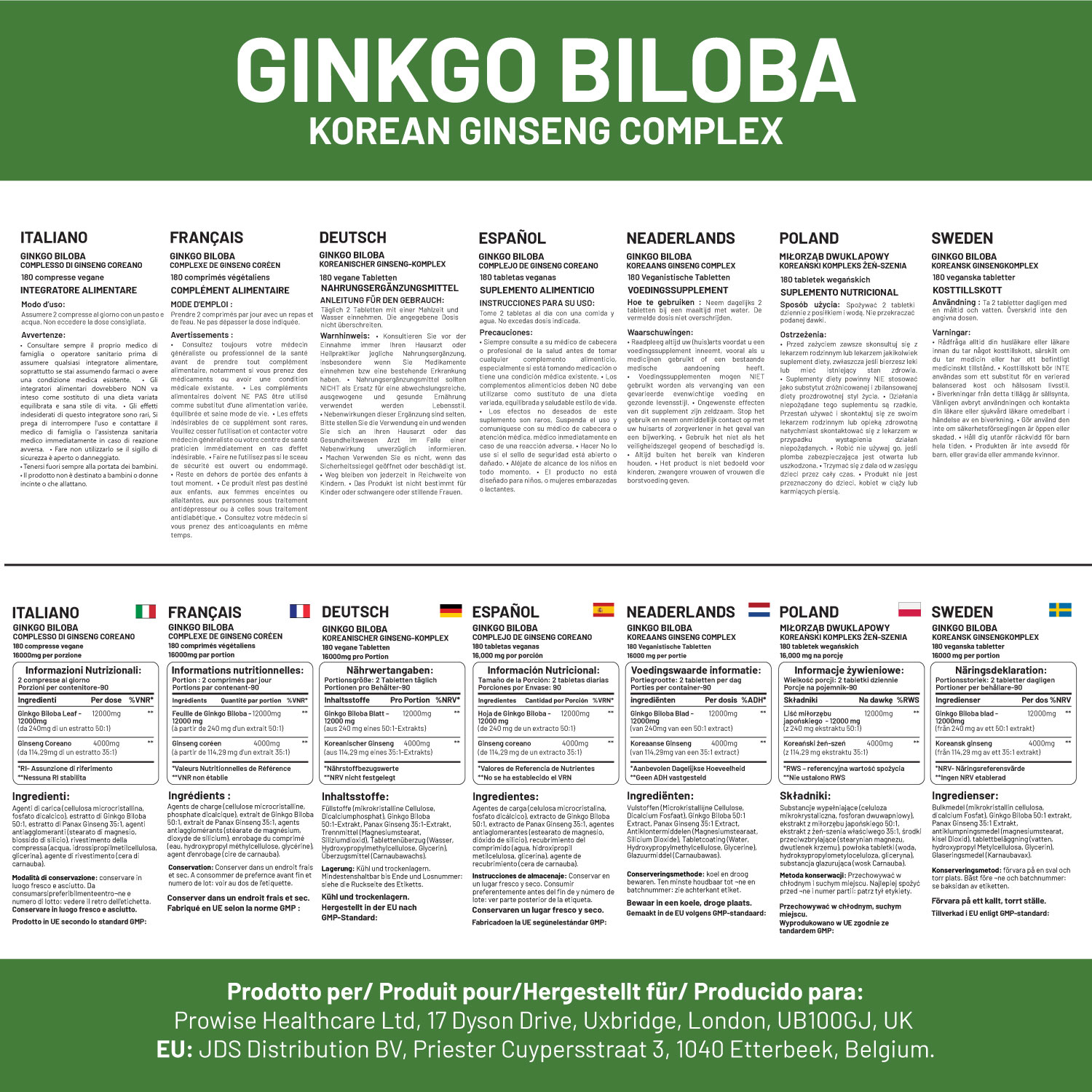 Ginkgo Biloba and Korean Ginseng Tablets 16000mg 180 Vegan Tablets by Prowise