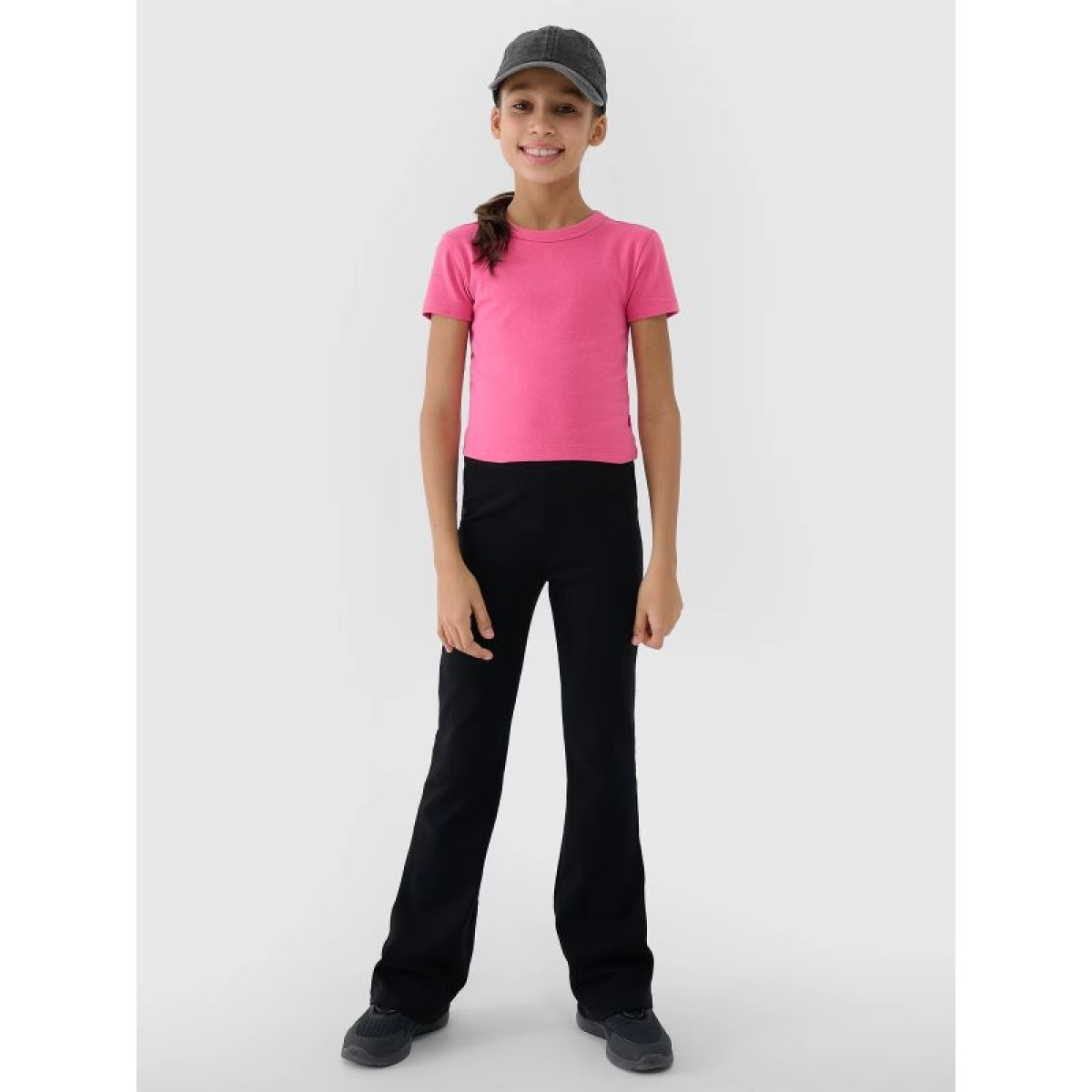 This T-shirt is made of soft rib knit fabric that gently clings to the body and is pleasant to the touch. The stretchy material adapts to the child's movements and allows for unrestricted movement during activity. The slim cut flatters the figure, and the round neckline with a light ribbed trim gives the entire piece a classic, girly look.