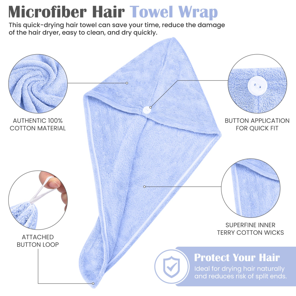 Need faster hair drying times! The large 64cm length towel with button hold will keep your hair up and help to dry your hair faster than a regular towel. Why? Simple. Microfibre is able to absorb more moisture than regular towels.