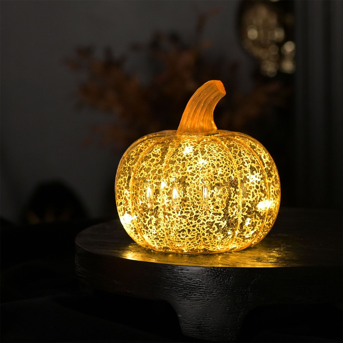 The decorative lantern showcases a distinctive gold pumpkin design with realistic patterning. Its LED lights fill the lantern with glowing colour.