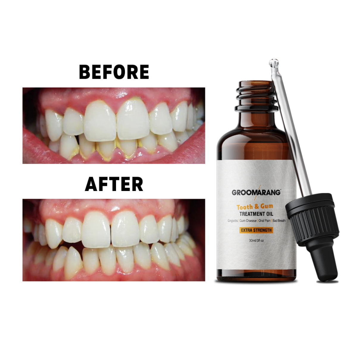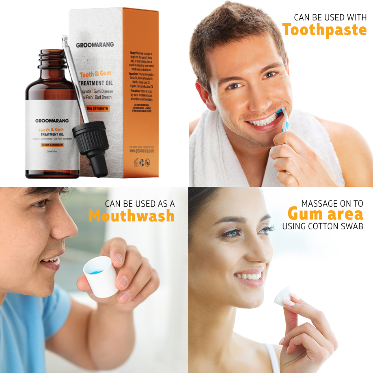 Groomarang extra strength tooth and gum treatment oil provides immediate relief from oral pain, while significant improvements have typically been reported within 30 days of initial use by patients suffering from advanced cases of chronic halitosis, cavities, gingivitis, gum and periodontal disease, bleeding and receding gums, dental pockets, plaque, thinning enamel, loose, dull, sensitive and abscesses teeth.
