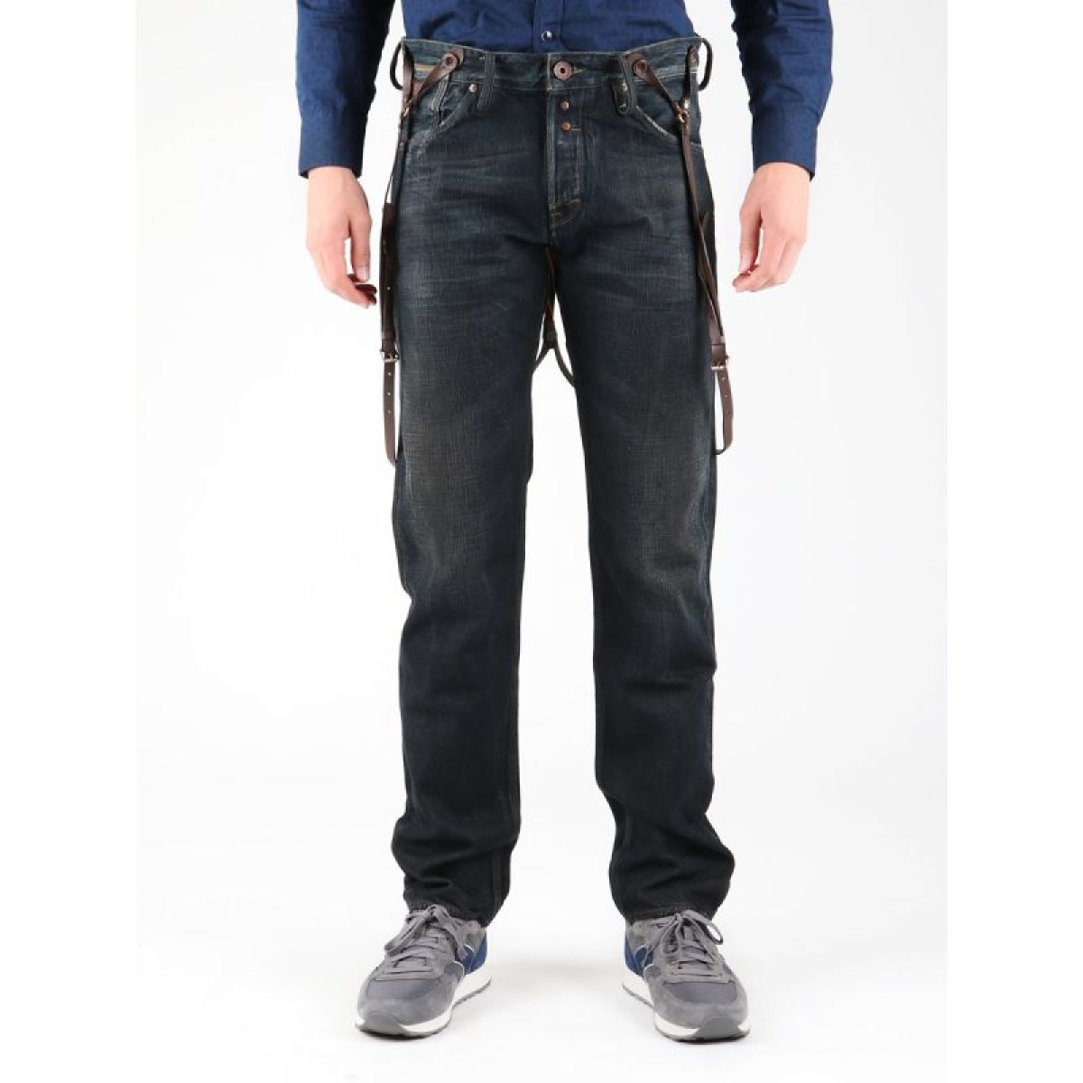 Men's jeans with a slightly tapered, wide leg. The trousers feature a button closure. Large pockets at the front and back. Guess leather logo at the back of the waistband.