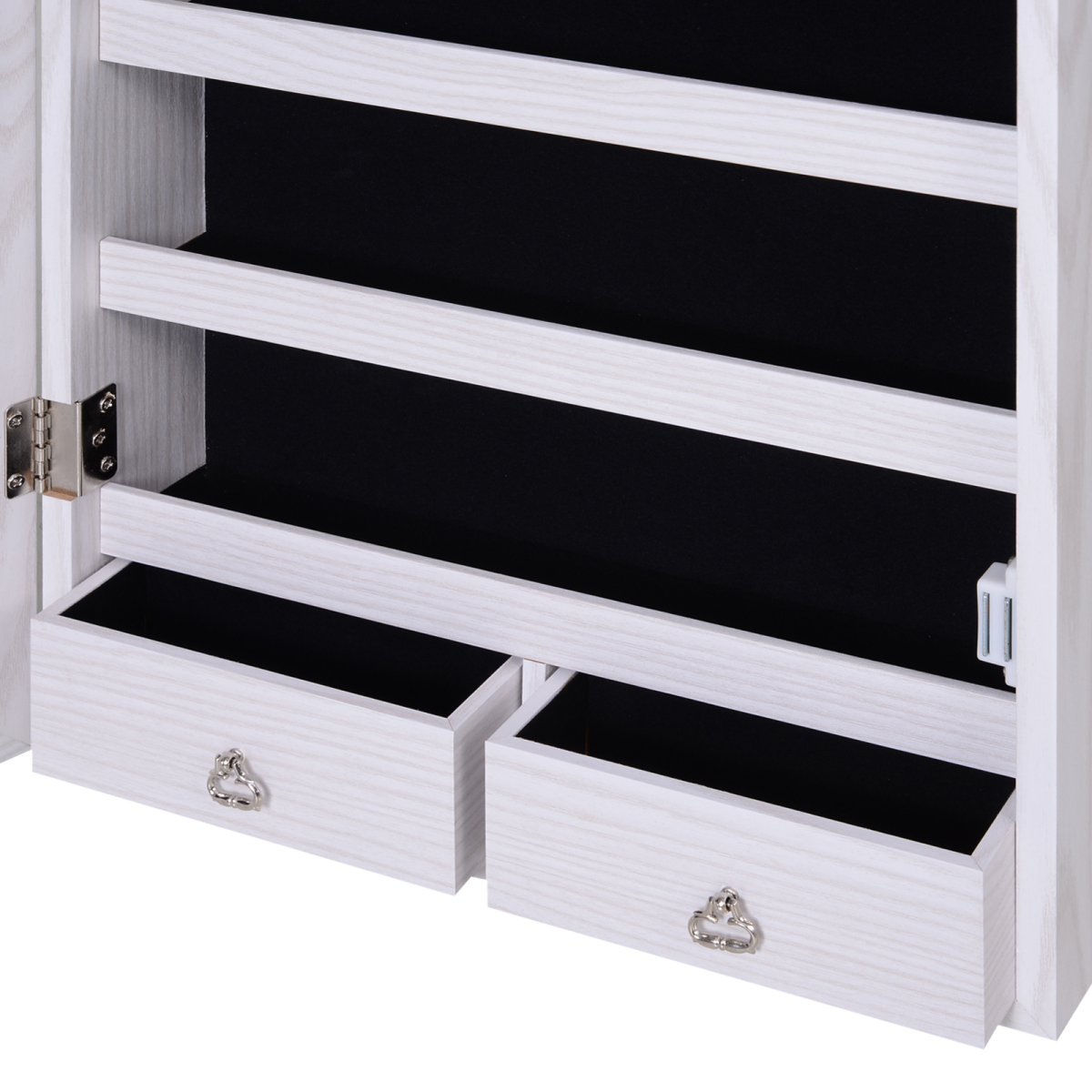 SPACIOUS: Inside opens to reveal six rows of earring slots, a bracelet loop, two rows of necklace hooks, six rows of ring slots, a small velvet-feel storage bag, five shelves and two small drawers. This mirror with storage is perfect for discreet storage and organisation in your bedroom.FRONT MIRROR: Come with a full length mirror, this mirrored jewellery storage cabinet is great for getting ready and putting your make-up on.OVER-DOOR HANGING DESIGN: The mirror jewellery cabinet can also be wall mounted, ideal for saving floor space in your bedroom. SIX INNER LED LIGHTS: Located at the top inside, they automatically turn on to help you find your jewellery.LOCKABLE: Keeps all your jewellery, perfumes etc. safely kept away. JEWELLERY ARMOIRE DIMENSIONS: 37W x 120H x 10T. Mirror: 120H x 37W x 0.3Dcm. Inner drawer: 6.5H x 16.5L x 6Wcm.MAXIMUM WEIGHT CAPACITY 10KG. ASSEMBLY REQUIRED. ALL ACCESSORIES INCLUDED.
