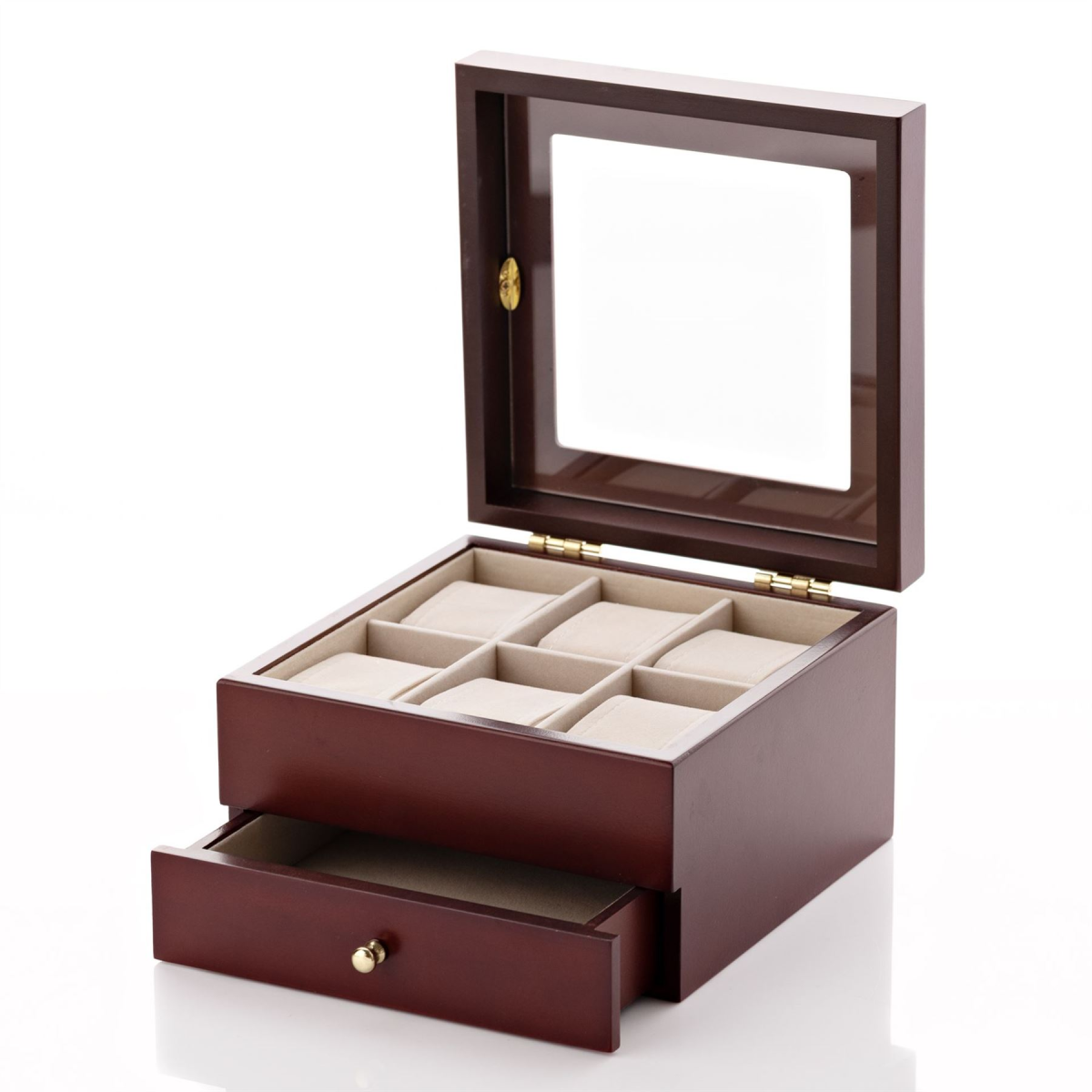 With six compartments and one drawer, this stunning walnut brown storage box is the perfect way to keep your watches safe. With a sophisticated design, this makes a great practical gift. Details: - 12cm x 18.5cm - Wood - Walnut brown with cream and silver - 6 compartments and one drawer - Glass window design