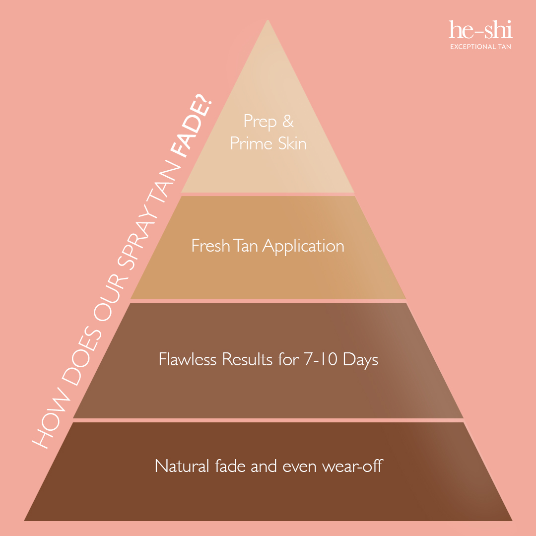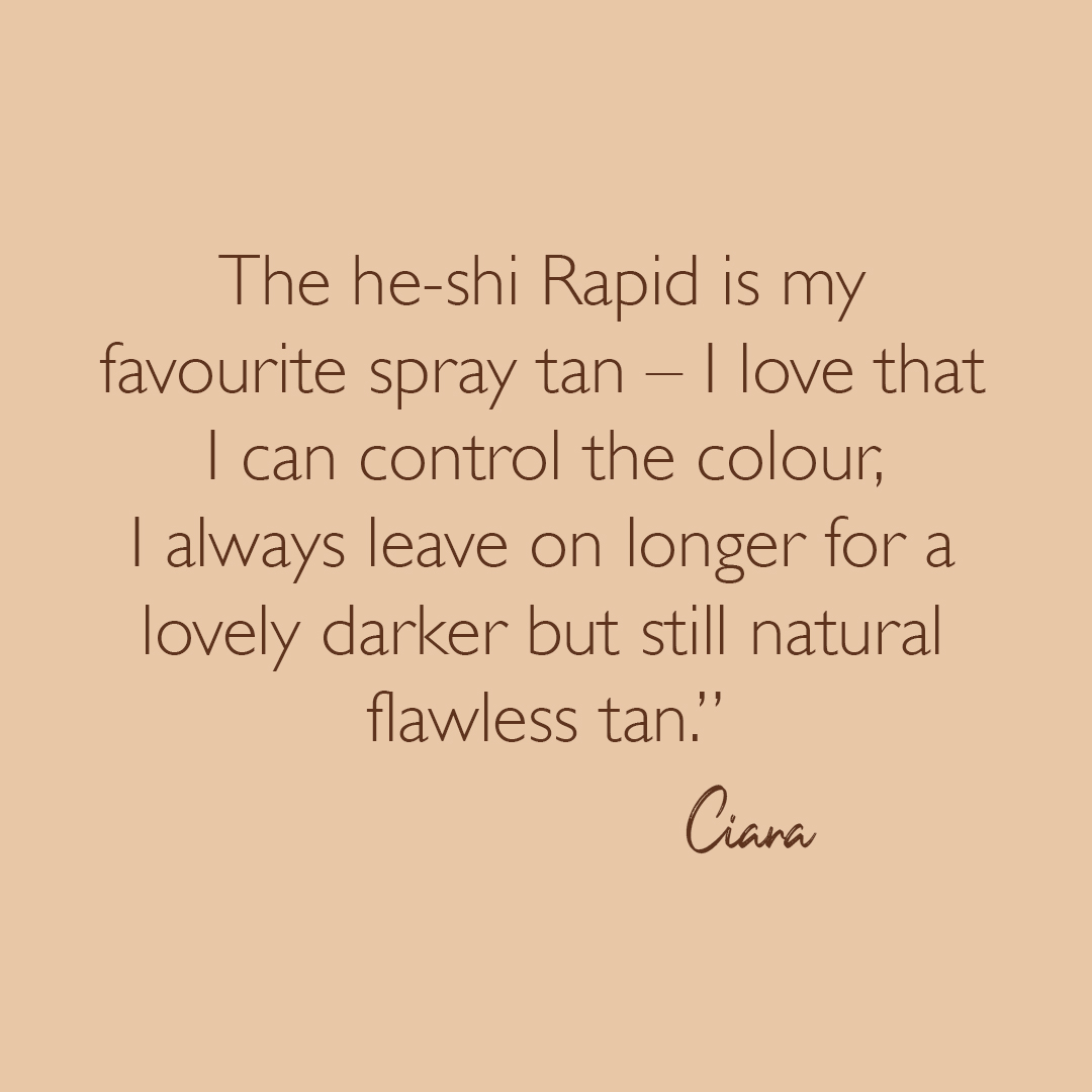 He-Shi Rapid Spray Tan Solution with 10% natural DHA.Part of He-Shi’s Pro-Advanced Collection, this Spray Tan is suitable for all skin types and uses Smart Tanning Technology to deliver a dark flawless natural glow in up to 4 hours. Tan to your own tone, a personalised finish.Scientifically advanced formulation designed to provide superior tanning results.Perfect everyday tanSuitable for medium to dark skin tonesAlcohol free and paraben free