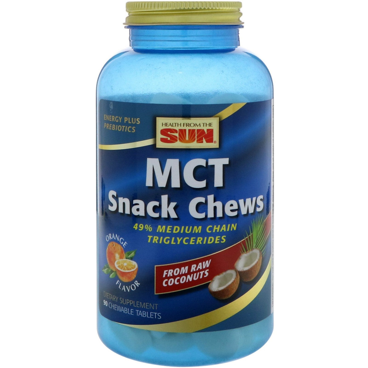 Energy Plus Prebiotics 49% Medium Chain Triglycerides From Raw Coconuts Dietary Supplement Medium chain triglycerides, called MCTs for short, are uniquely fatty acids that provide a wide range of potential health benefits. MCTs differ from long chain fatty acids of other foods because they are more rapidly absorbed by the body and more easily burned as fuel rather than stored as fat. MCTs are often used by athletes to help increase energy, metabolism and endurance. MCTs are also popular with individuals on a ketogenic diet. Studies suggest that MCTs may support ketone body production. Health From The Sun MCT Chews are a quick and convenient form of MCTs for an active lifestyle. Take them on the road, to the gym, bike rides or trail runs for an easy and convenient form of energy that won't fill you up or slow you down.