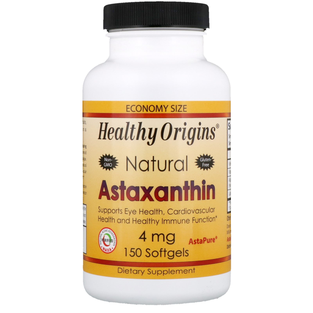 Economy Size Non-GMO Gluten Free AstaPure Natural Supports Eye Health, Cardiovascular Health and Healthy Immune Function NAXA - Natural Algae Astaxanthin - Verified Dietary Supplement Healthy Origins Natural Astaxanthin featuring AstaPure Natural Astaxanthin is a carotenoid produced from Haematococcus pluvalis microalgae. Research has shown that consumption of natural astaxanthin may support joint health, cardiovascular health, eye health and healthy immune function. AstaPure Astaxanthin utilizes a supercritical CO2 extraction process and is produced in a state-of-the-art closed bioreactor system covering more than 15 acres in Israel's Arava Desert.