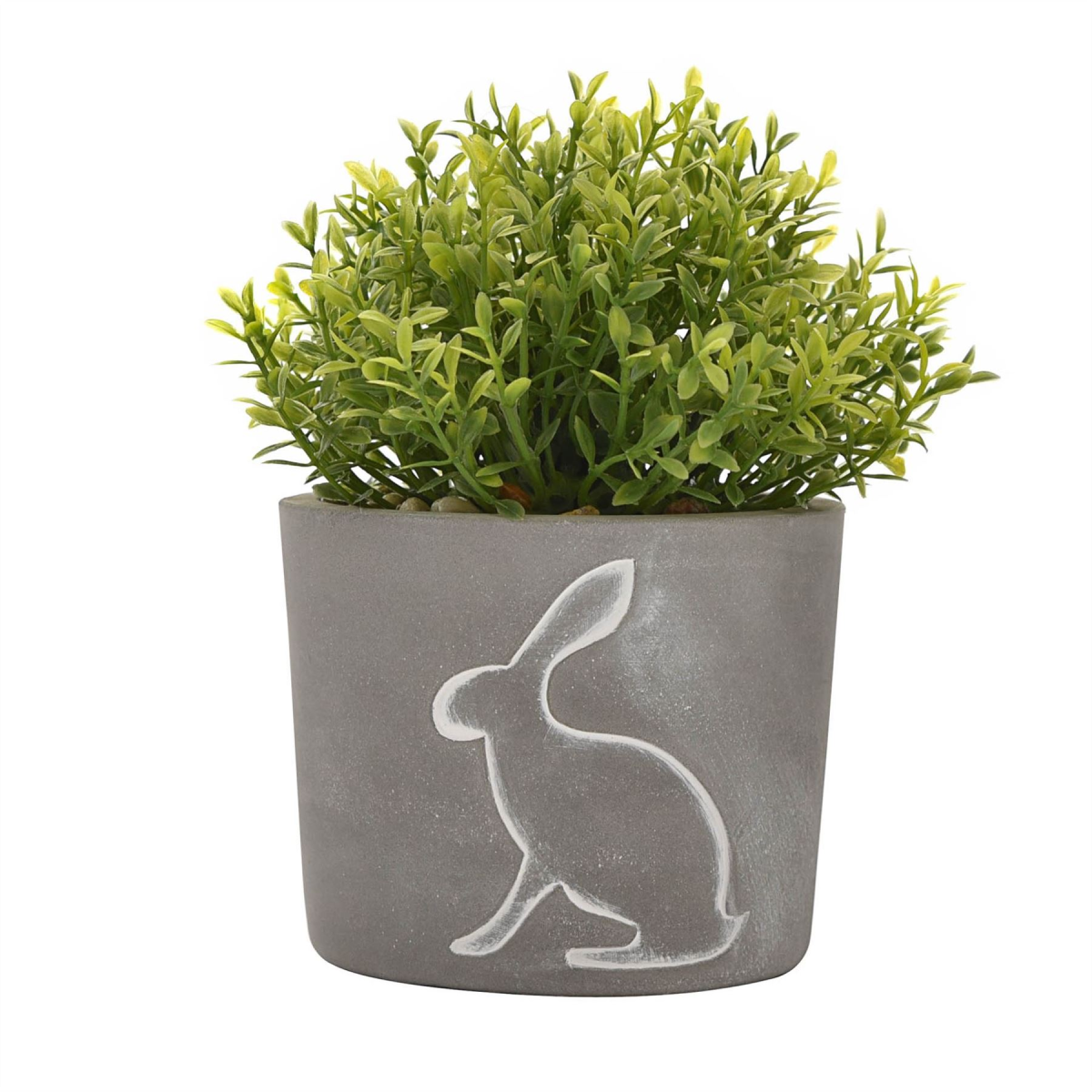A hare silhouette planter with plant from the Reconnect collection by HESTIA�. This ornate planter instantly brightens up homes with maintenance free greenery. The concrete planter features a lovingly designed hare silhouette which stands out against its grey backdrop. Inside the planter sits a realistic faux plant, complete with small pebbles. The planter is packaged in a brown closed box.