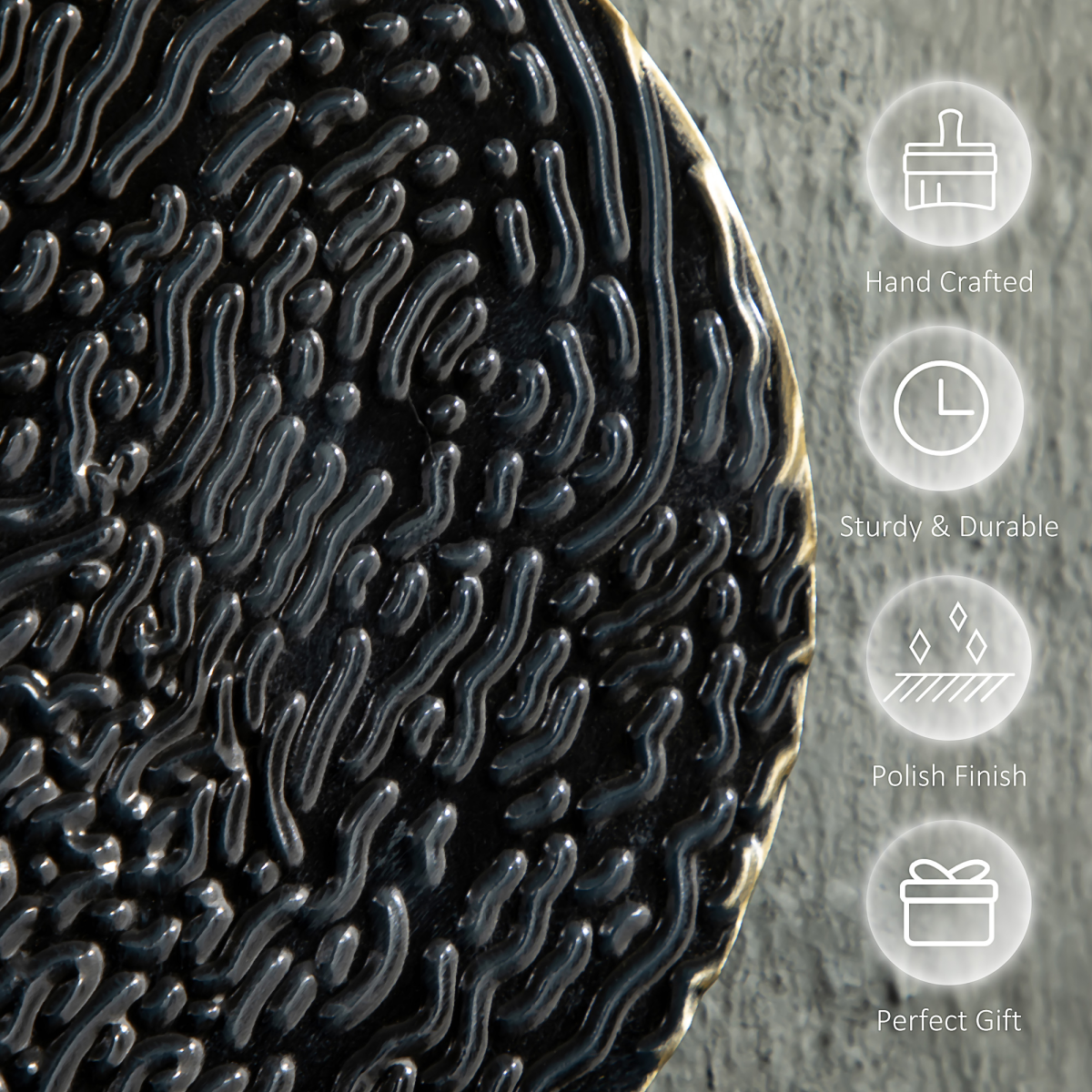 Multi-disc design: A 3D wall art piece - this metal wall art combines black, blue and gold and silver tone pieces all merged into one. Textured finish on the discs for a unique finish.Ready to hang: Metal wall art comes with an outer frame - easy for you to stick it up. Built-in hooks and hanging accessory toolkit included - just attach where you want.Metal structure: Living room wall art which is made to last - a tough structure which is resistant to cracking and fading. Something to keep for years to come.Home versatility: This large wall art will look great practically anywhere - from the bedroom, hallway, living room, kitchen and study office.Dimensions: 66H x 133Wcm.