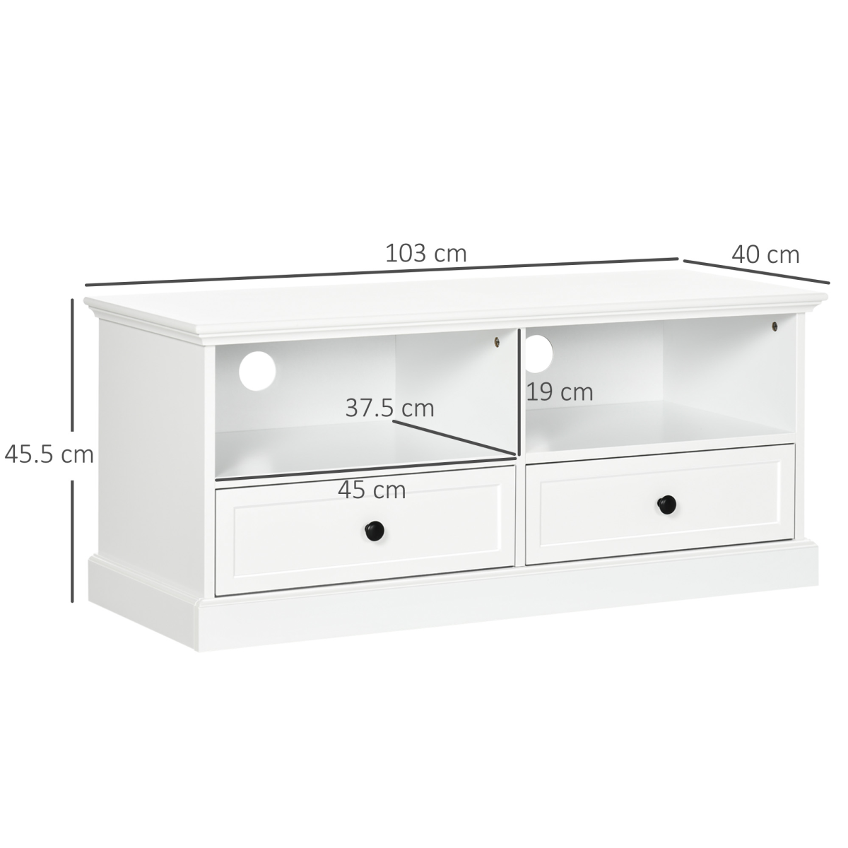 STORAGE: TV cabinet comes with two drawers for discreetly keeping media items stored. Top two shelves allow open display. Table top is roomy enough for TVs up to 45".CLEAN AND SIMPLE STYLE: White colour means this entertainment unit is a truly versatile piece - super easy to work with your current furniture. Embossed edges and black handles break this white tv unit up gently.STURDY: Made from MDF, this tv stand will support all you have stored and standing on there. Big base so it stands steady. Suitable for everyday use in your home and office.CABLE MANAGEMENT: TV tables comes with two holes in the back - wires can be pulled through and kept together, keeping them tidy.DIMENSIONS: 45.5H x 103W x 40Dcm. Drawer inner: 9.5H x 40.5W x 28.5Dcm. Shelf: 19H x 45W x 37.5Dcm. Maximum load 50kg. ASSEMBLY REQUIRED.